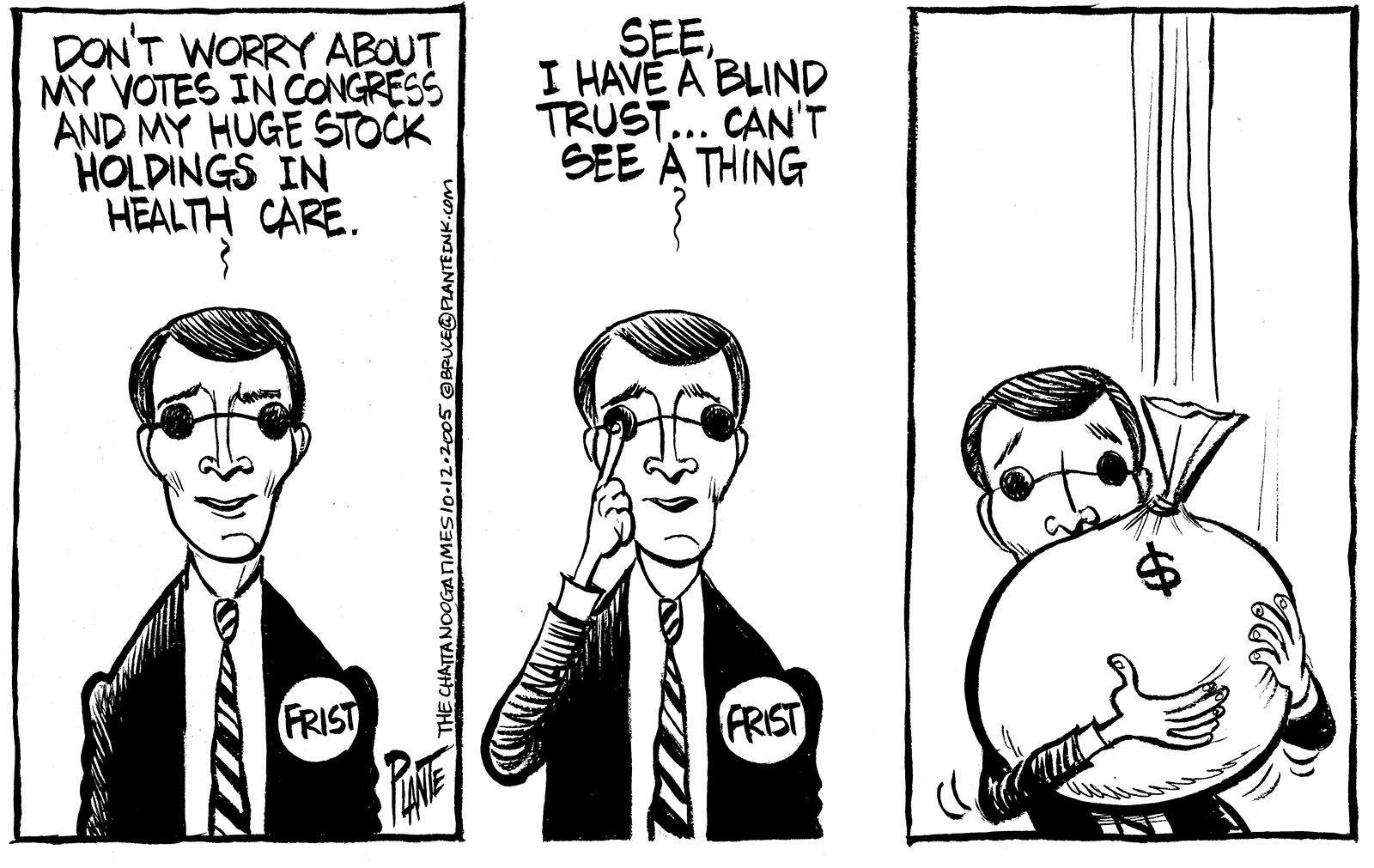 Tags/Keywords Bill Frist, Blind trust, HCA, Health Care, Senate Majority Leader, Senator Bill Frist, FILE: PlantB20051013 Reprint This CartoonBuy A PrintBuy The Original REPRINT THIS CARTOON Fill out the info below and I'll be in touch ASAP Your Name (required) Your Email (required) Details, Print, Digital, Circulation, etc. Please leave this field empty. BUY A PRINT OF THIS CARTOON Fill out the info below and I'll be in touch ASAP Your Name(required) Your Email(required) Details, Number of copies, Questions. Please leave this field empty. BUY THE ORIGINAL Originals may or may not be available. Fill out the info below and I'll be in touch ASAP Your Name (required) Your Email (required) Your Message Please leave this field empty.