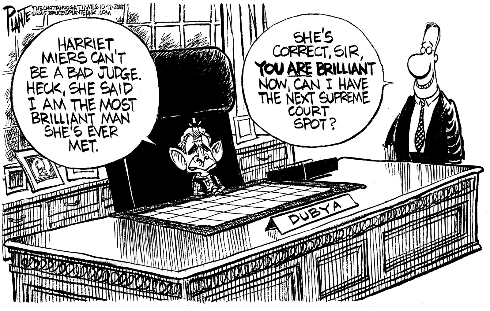 Tags/Keywords Bush Brilliant, Dubya, Harriet Miers, Miers, President Bush, Supreme Court, FILE: PlantB20051016 Reprint This CartoonBuy A PrintBuy The Original REPRINT THIS CARTOON Fill out the info below and I'll be in touch ASAP Your Name (required) Your Email (required) Details, Print, Digital, Circulation, etc. Please leave this field empty. BUY A PRINT OF THIS CARTOON Fill out the info below and I'll be in touch ASAP Your Name(required) Your Email(required) Details, Number of copies, Questions. Please leave this field empty. BUY THE ORIGINAL Originals may or may not be available. Fill out the info below and I'll be in touch ASAP Your Name (required) Your Email (required) Your Message Please leave this field empty.