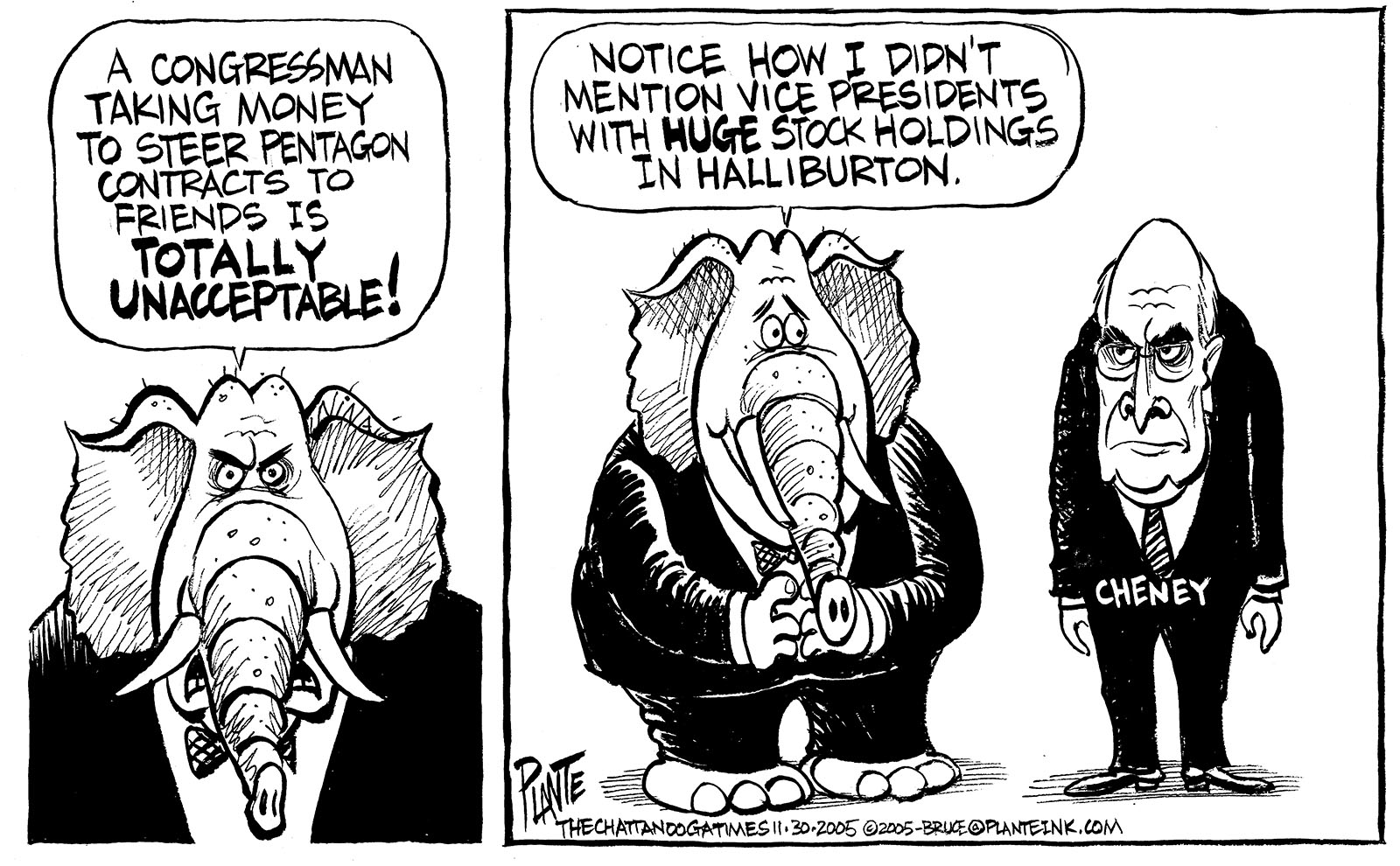 Tags/Keywords Congressional bribes, Cunningham, Dick Cheney, Halliburton, U.S. Congress, FILE: PlantB20051201 Reprint This CartoonBuy A PrintBuy The Original REPRINT THIS CARTOON Fill out the info below and I'll be in touch ASAP Your Name (required) Your Email (required) Details, Print, Digital, Circulation, etc. Please leave this field empty. BUY A PRINT OF THIS CARTOON Fill out the info below and I'll be in touch ASAP Your Name(required) Your Email(required) Details, Number of copies, Questions. Please leave this field empty. BUY THE ORIGINAL Originals may or may not be available. Fill out the info below and I'll be in touch ASAP Your Name (required) Your Email (required) Your Message Please leave this field empty.