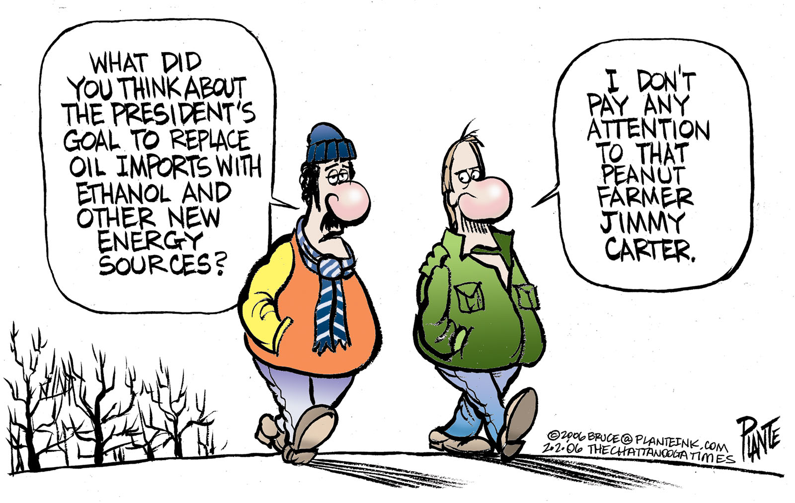 Tags/Keywords Ethanol, George W. Bush, Jimmy Carter, New energy Sources, Oil, Oil Imports, State of the Union, FILE: PlantB20060203 Reprint This CartoonBuy A PrintBuy The Original REPRINT THIS CARTOON Fill out the info below and I'll be in touch ASAP Your Name (required) Your Email (required) Details, Print, Digital, Circulation, etc. Please leave this field empty. BUY A PRINT OF THIS CARTOON Fill out the info below and I'll be in touch ASAP Your Name(required) Your Email(required) Details, Number of copies, Questions. Please leave this field empty. BUY THE ORIGINAL Originals may or may not be available. Fill out the info below and I'll be in touch ASAP Your Name (required) Your Email (required) Your Message Please leave this field empty.