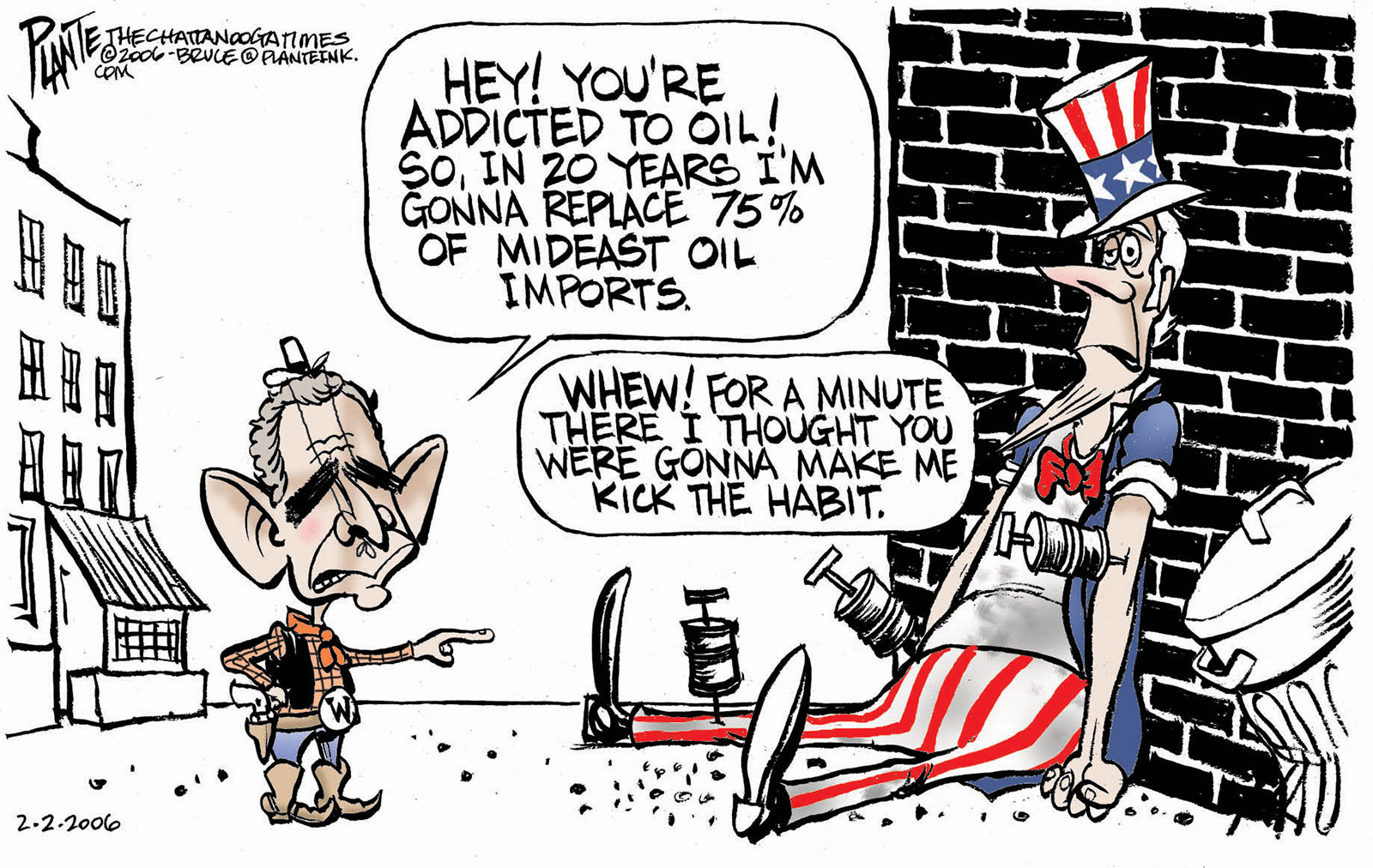 Tags/Keywords George W. Bush, Mideast Oil, Oil, Oil Imports, State of the Union, FILE: PlantB20060205 Reprint This CartoonBuy A PrintBuy The Original REPRINT THIS CARTOON Fill out the info below and I'll be in touch ASAP Your Name (required) Your Email (required) Details, Print, Digital, Circulation, etc. Please leave this field empty. BUY A PRINT OF THIS CARTOON Fill out the info below and I'll be in touch ASAP Your Name(required) Your Email(required) Details, Number of copies, Questions. Please leave this field empty. BUY THE ORIGINAL Originals may or may not be available. Fill out the info below and I'll be in touch ASAP Your Name (required) Your Email (required) Your Message Please leave this field empty.