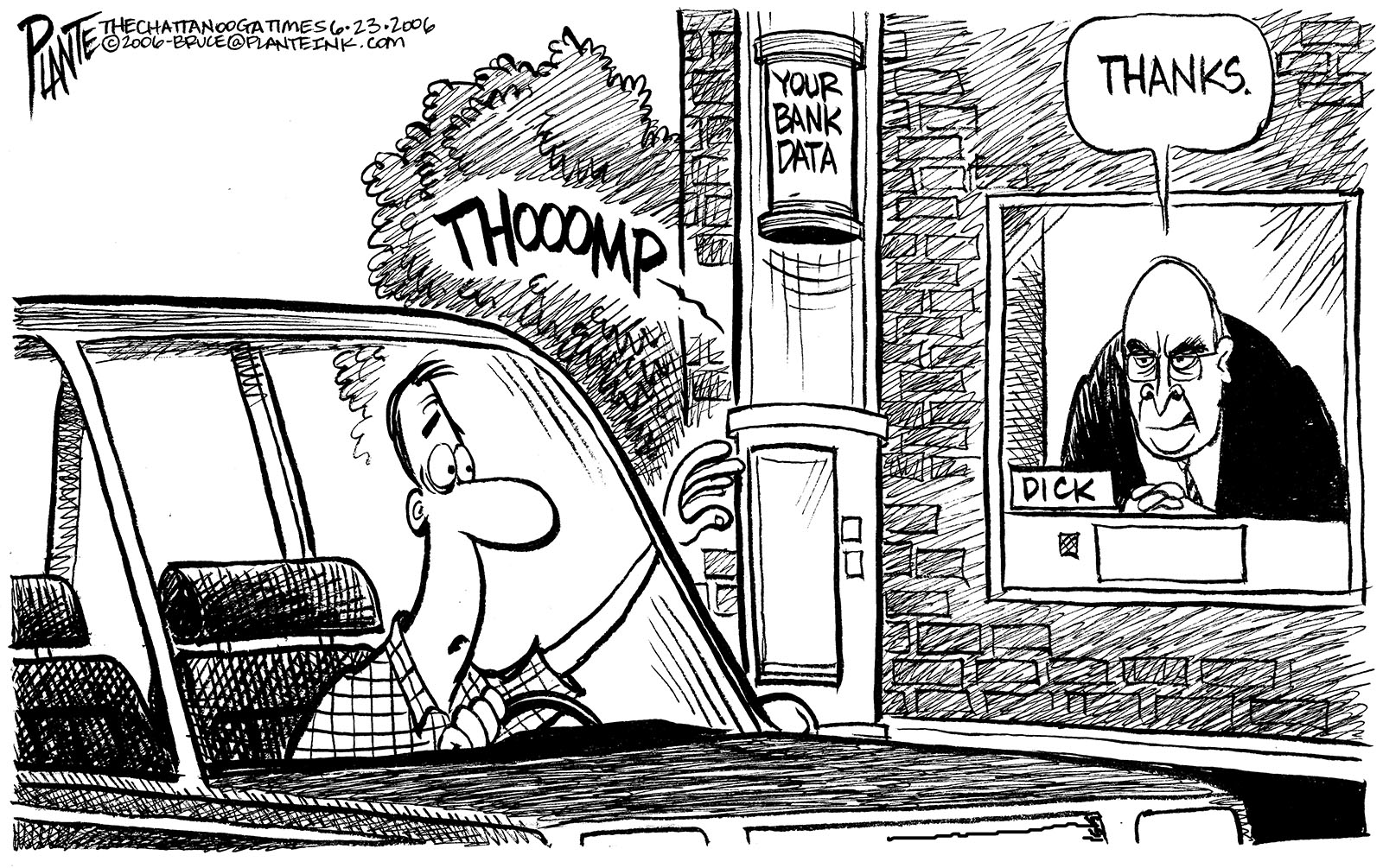 Tags/Keywords Bank Data, Dick Cheney, George W. Bush, Secret Bank Data Sifting, FILE: PlantB20060630 Reprint This CartoonBuy A PrintBuy The Original REPRINT THIS CARTOON Fill out the info below and I'll be in touch ASAP Your Name (required) Your Email (required) Details, Print, Digital, Circulation, etc. Please leave this field empty. BUY A PRINT OF THIS CARTOON Fill out the info below and I'll be in touch ASAP Your Name(required) Your Email(required) Details, Number of copies, Questions. Please leave this field empty. BUY THE ORIGINAL Originals may or may not be available. Fill out the info below and I'll be in touch ASAP Your Name (required) Your Email (required) Your Message Please leave this field empty.