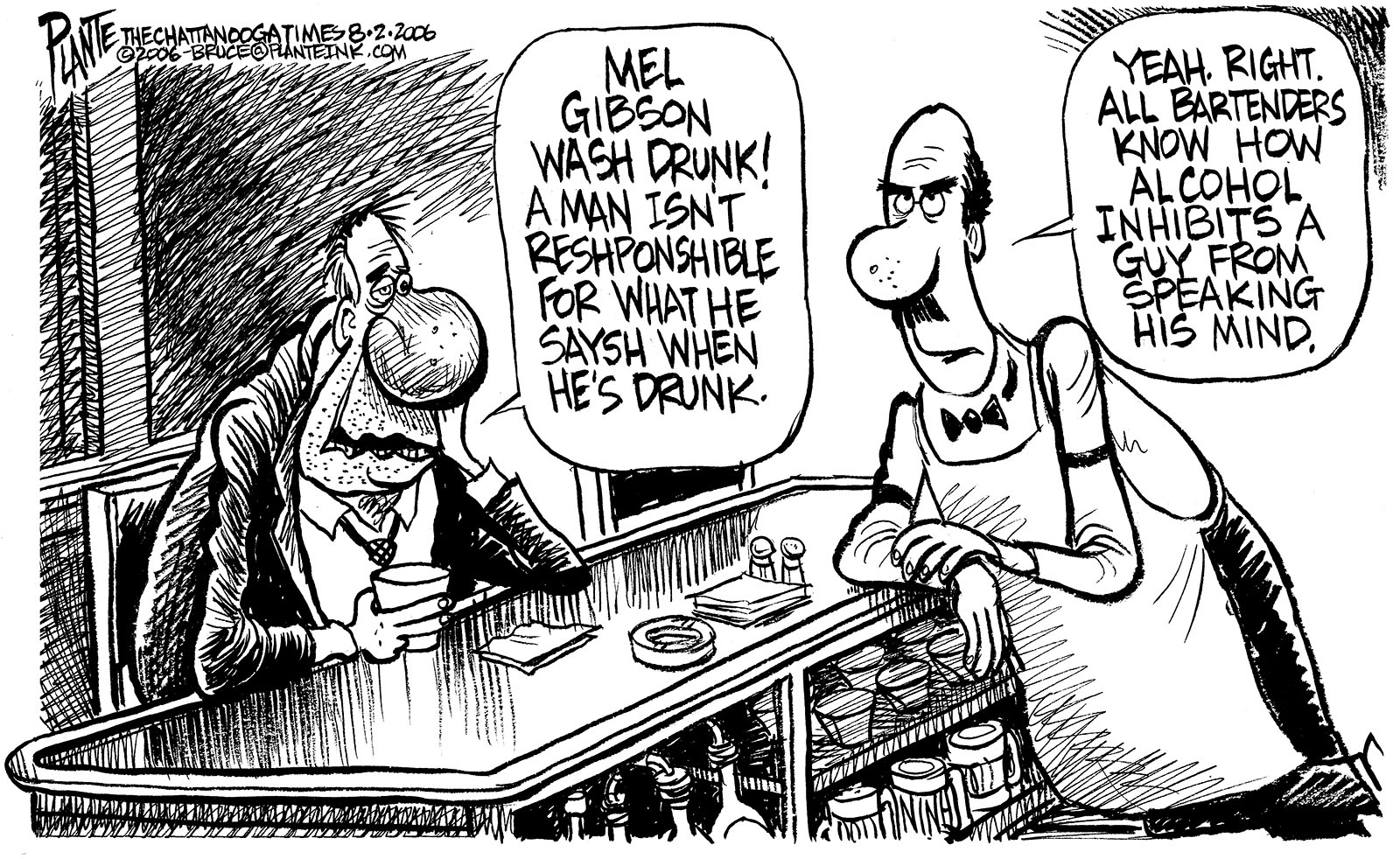 Tags/Keywords Alcohol, Bartenders, Mel Gibson, FILE: PlantB20060803 Reprint This CartoonBuy A PrintBuy The Original REPRINT THIS CARTOON Fill out the info below and I'll be in touch ASAP Your Name (required) Your Email (required) Details, Print, Digital, Circulation, etc. Please leave this field empty. BUY A PRINT OF THIS CARTOON Fill out the info below and I'll be in touch ASAP Your Name(required) Your Email(required) Details, Number of copies, Questions. Please leave this field empty. BUY THE ORIGINAL Originals may or may not be available. Fill out the info below and I'll be in touch ASAP Your Name (required) Your Email (required) Your Message Please leave this field empty.