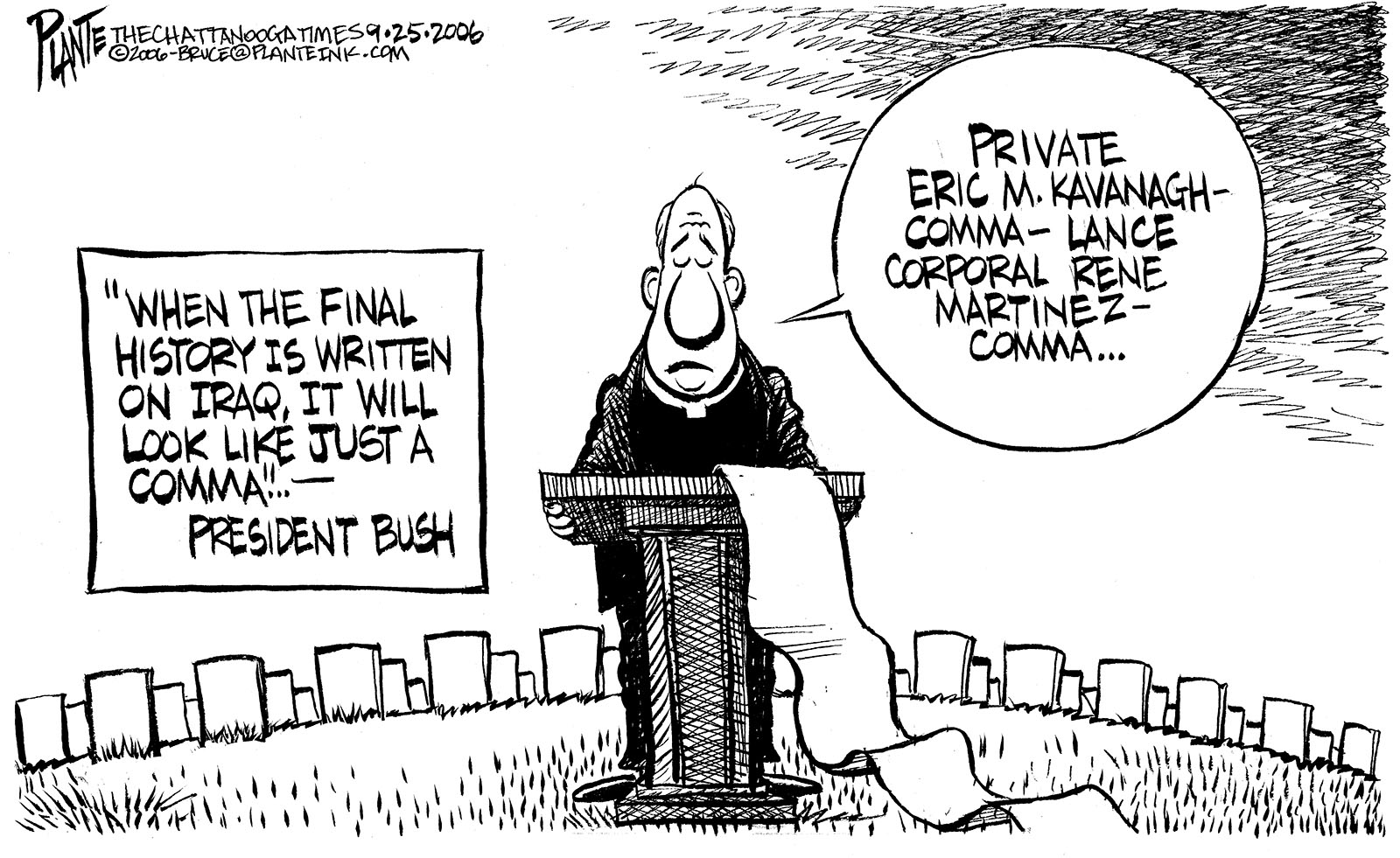 Tags/Keywords Fallen heroes, George W. Bush, Iraq, Iraqi War, War in iraq, FILE: PlantB20060928 Reprint This CartoonBuy A PrintBuy The Original REPRINT THIS CARTOON Fill out the info below and I'll be in touch ASAP Your Name (required) Your Email (required) Details, Print, Digital, Circulation, etc. Please leave this field empty. BUY A PRINT OF THIS CARTOON Fill out the info below and I'll be in touch ASAP Your Name(required) Your Email(required) Details, Number of copies, Questions. Please leave this field empty. BUY THE ORIGINAL Originals may or may not be available. Fill out the info below and I'll be in touch ASAP Your Name (required) Your Email (required) Your Message Please leave this field empty.