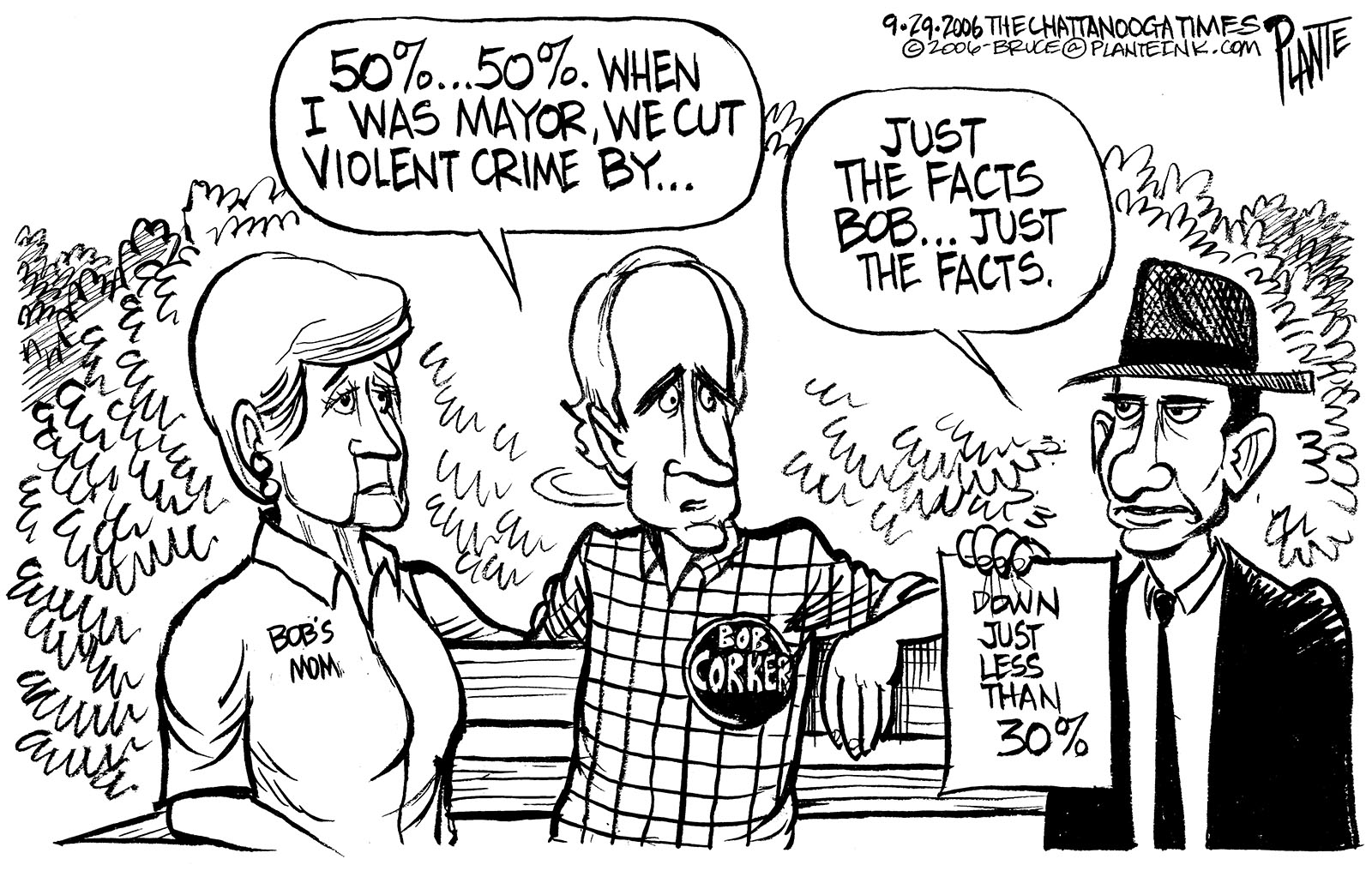 Tags/Keywords Bob Corker, Chattanooga, Chattanooga Crime Rate, Chattanooga Violent Crime Rate, Republican Senate, Tennessee, Tennessee Senate Race, FILE: PlantB20060930 Reprint This CartoonBuy A PrintBuy The Original REPRINT THIS CARTOON Fill out the info below and I'll be in touch ASAP Your Name (required) Your Email (required) Details, Print, Digital, Circulation, etc. Please leave this field empty. BUY A PRINT OF THIS CARTOON Fill out the info below and I'll be in touch ASAP Your Name(required) Your Email(required) Details, Number of copies, Questions. Please leave this field empty. BUY THE ORIGINAL Originals may or may not be available. Fill out the info below and I'll be in touch ASAP Your Name (required) Your Email (required) Your Message Please leave this field empty.