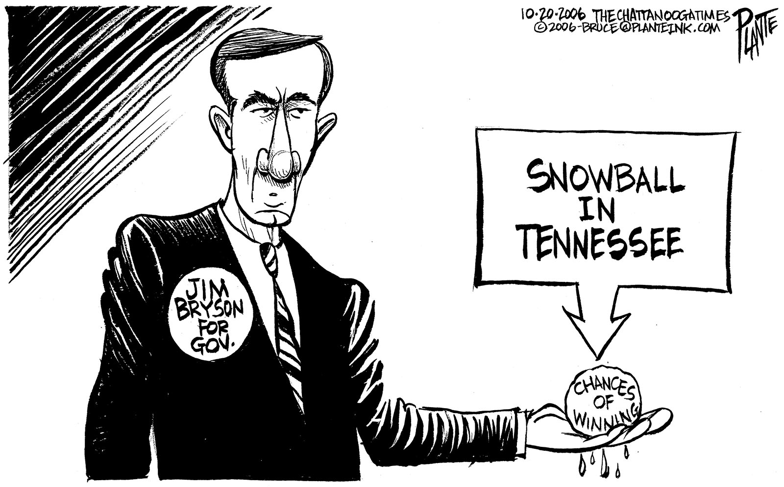 Tags/Keywords Jim Bryson, Tennessee, Tennessee Gubernatorial Race, FILE: PlantB20061021 Reprint This CartoonBuy A PrintBuy The Original REPRINT THIS CARTOON Fill out the info below and I'll be in touch ASAP Your Name (required) Your Email (required) Details, Print, Digital, Circulation, etc. Please leave this field empty. BUY A PRINT OF THIS CARTOON Fill out the info below and I'll be in touch ASAP Your Name(required) Your Email(required) Details, Number of copies, Questions. Please leave this field empty. BUY THE ORIGINAL Originals may or may not be available. Fill out the info below and I'll be in touch ASAP Your Name (required) Your Email (required) Your Message Please leave this field empty.