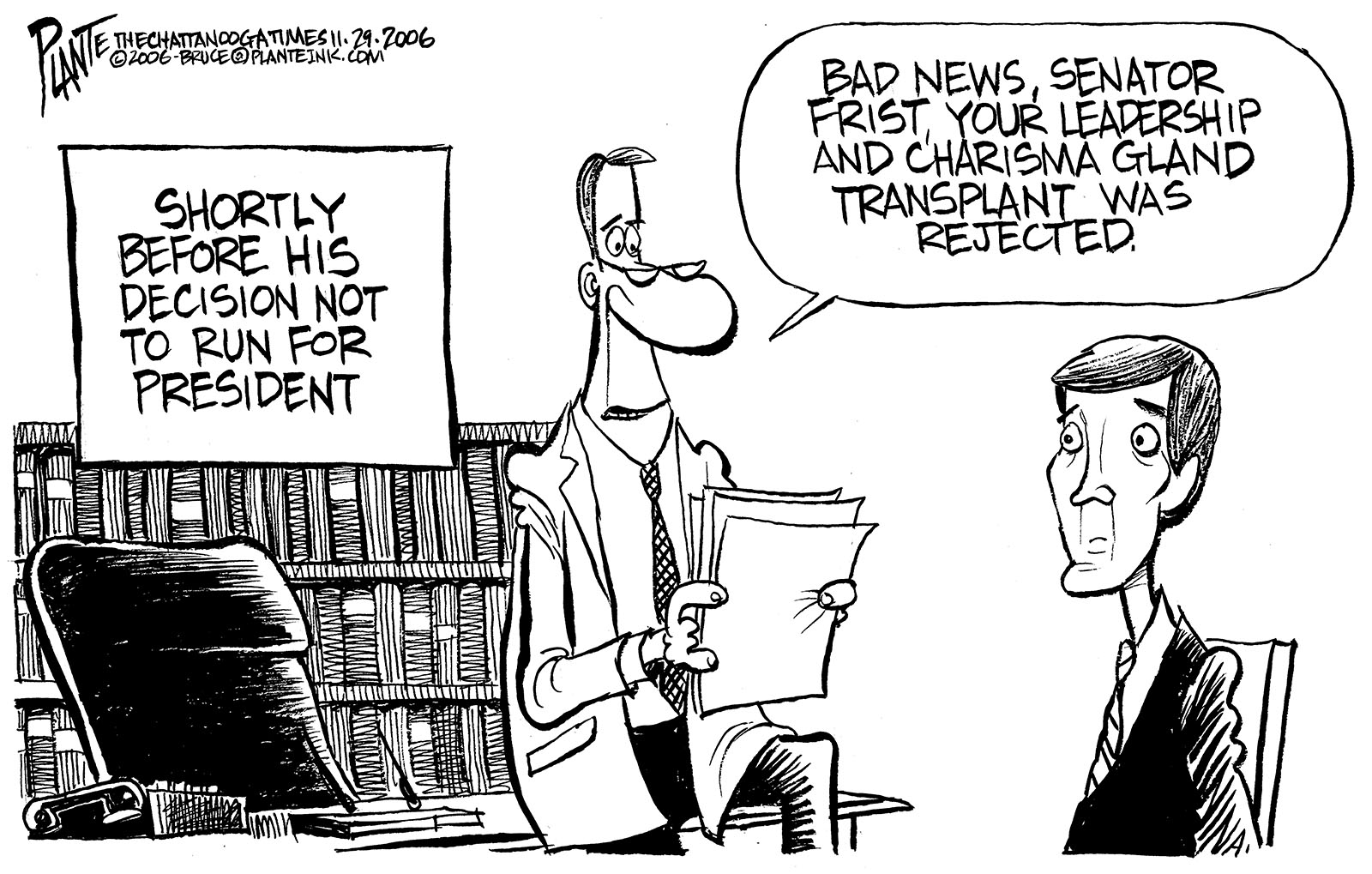 Tags/Keywords Dr. Bill Frist, Presidential Campaign, Senate Majority Leader, Senator Bill Frist, Tennessee, FILE: PlantB20061130 Reprint This CartoonBuy A PrintBuy The Original REPRINT THIS CARTOON Fill out the info below and I'll be in touch ASAP Your Name (required) Your Email (required) Details, Print, Digital, Circulation, etc. Please leave this field empty. BUY A PRINT OF THIS CARTOON Fill out the info below and I'll be in touch ASAP Your Name(required) Your Email(required) Details, Number of copies, Questions. Please leave this field empty. BUY THE ORIGINAL Originals may or may not be available. Fill out the info below and I'll be in touch ASAP Your Name (required) Your Email (required) Your Message Please leave this field empty.