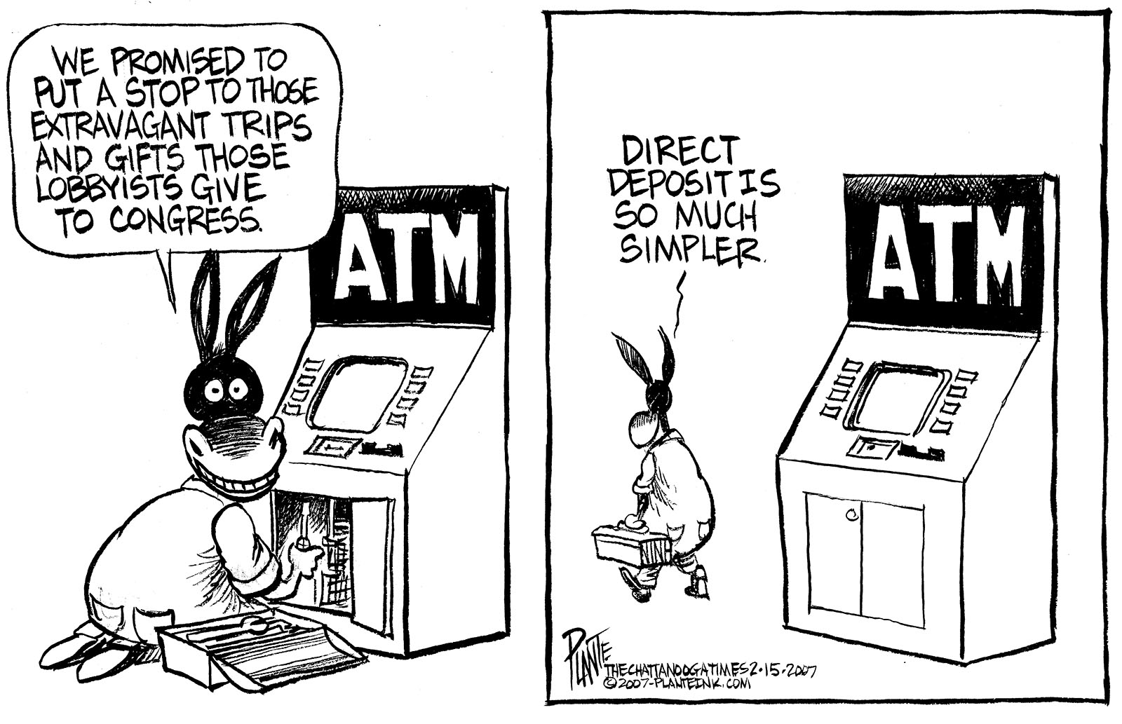 Tags/Keywords Democratic Party, Ethics Reform, U.S. Congress, FILE: PlantB20070218 Reprint This CartoonBuy A PrintBuy The Original REPRINT THIS CARTOON Fill out the info below and I'll be in touch ASAP Your Name (required) Your Email (required) Details, Print, Digital, Circulation, etc. Please leave this field empty. BUY A PRINT OF THIS CARTOON Fill out the info below and I'll be in touch ASAP Your Name(required) Your Email(required) Details, Number of copies, Questions. Please leave this field empty. BUY THE ORIGINAL Originals may or may not be available. Fill out the info below and I'll be in touch ASAP Your Name (required) Your Email (required) Your Message Please leave this field empty.