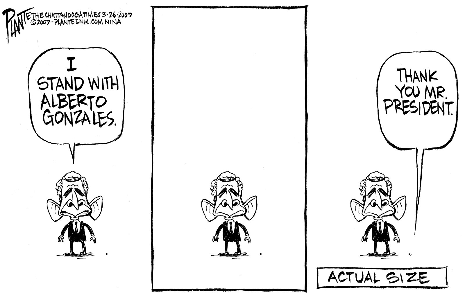 Tags/Keywords Alberto Gonzales, Attoney General Gonzales, Dubya, George W. Bush, President Bush, Washington D.C., FILE: PlantB20070327 Reprint This CartoonBuy A PrintBuy The Original REPRINT THIS CARTOON Fill out the info below and I'll be in touch ASAP Your Name (required) Your Email (required) Details, Print, Digital, Circulation, etc. Please leave this field empty. BUY A PRINT OF THIS CARTOON Fill out the info below and I'll be in touch ASAP Your Name(required) Your Email(required) Details, Number of copies, Questions. Please leave this field empty. BUY THE ORIGINAL Originals may or may not be available. Fill out the info below and I'll be in touch ASAP Your Name (required) Your Email (required) Your Message Please leave this field empty.