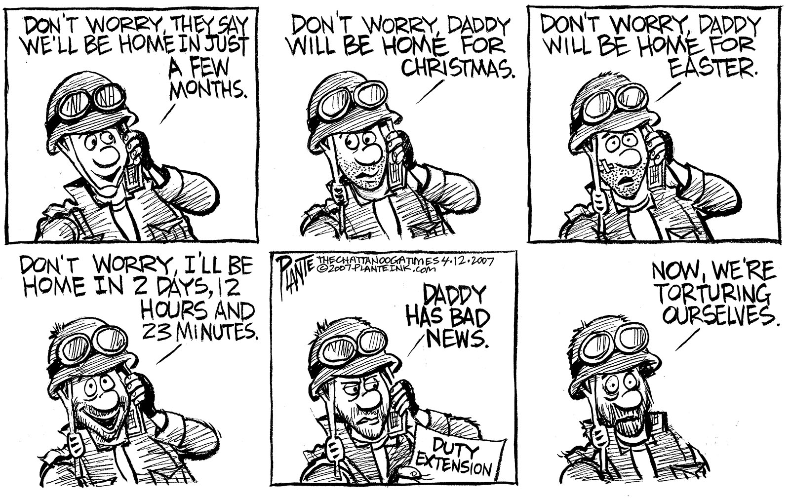 Tags/Keywords Afghanistan, Duty Extension, Extended Duty, Iraq, U.S. Troops, FILE: PlantB20070415 Reprint This CartoonBuy A PrintBuy The Original REPRINT THIS CARTOON Fill out the info below and I'll be in touch ASAP Your Name (required) Your Email (required) Details, Print, Digital, Circulation, etc. Please leave this field empty. BUY A PRINT OF THIS CARTOON Fill out the info below and I'll be in touch ASAP Your Name(required) Your Email(required) Details, Number of copies, Questions. Please leave this field empty. BUY THE ORIGINAL Originals may or may not be available. Fill out the info below and I'll be in touch ASAP Your Name (required) Your Email (required) Your Message Please leave this field empty.