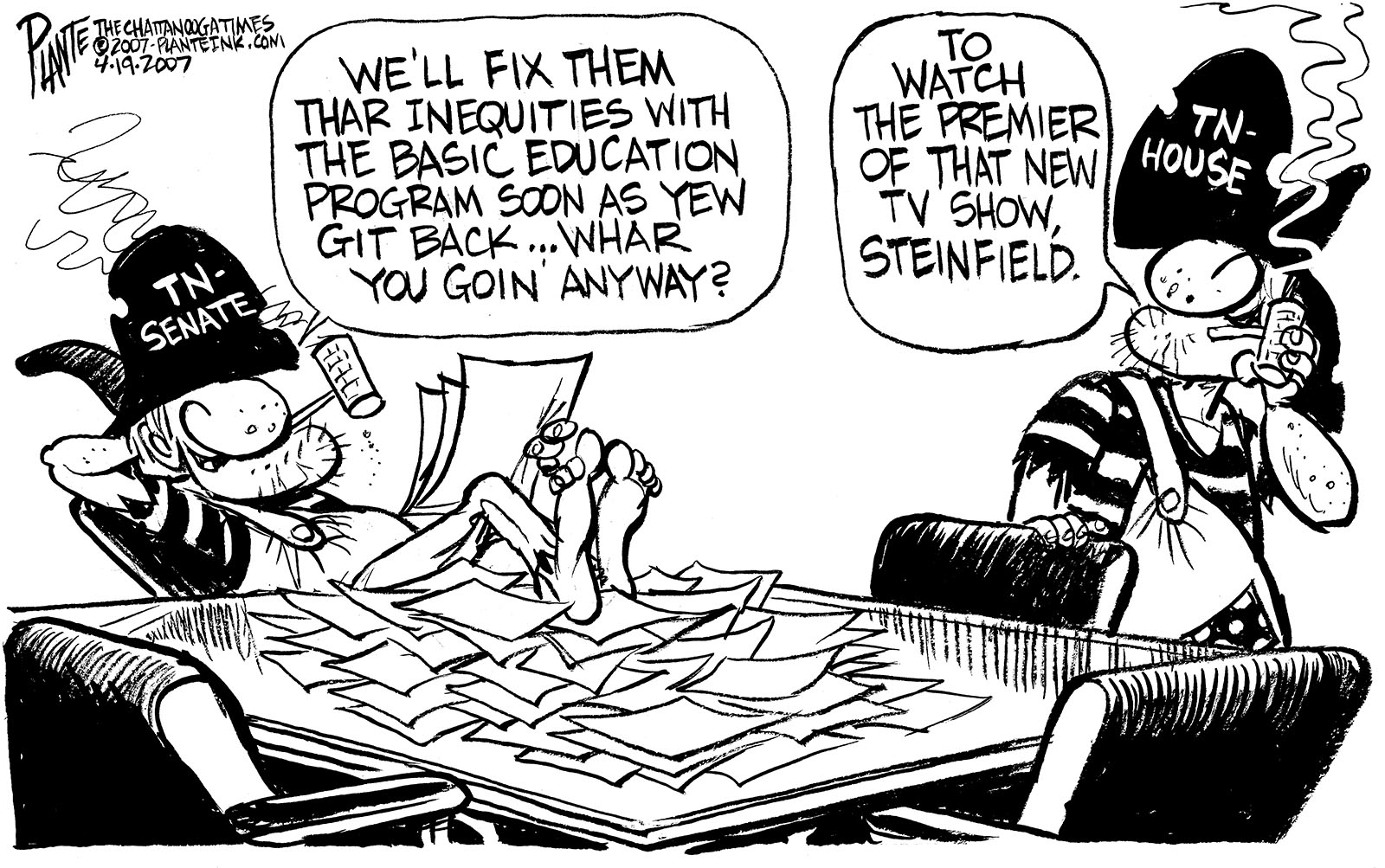 Tags/Keywords Basic Education Program, Seinfeld, Tennessee legislature, Tennessee State House, Tennessee State Senate, FILE: PlantB20070422 Reprint This CartoonBuy A PrintBuy The Original REPRINT THIS CARTOON Fill out the info below and I'll be in touch ASAP Your Name (required) Your Email (required) Details, Print, Digital, Circulation, etc. Please leave this field empty. BUY A PRINT OF THIS CARTOON Fill out the info below and I'll be in touch ASAP Your Name(required) Your Email(required) Details, Number of copies, Questions. Please leave this field empty. BUY THE ORIGINAL Originals may or may not be available. Fill out the info below and I'll be in touch ASAP Your Name (required) Your Email (required) Your Message Please leave this field empty.