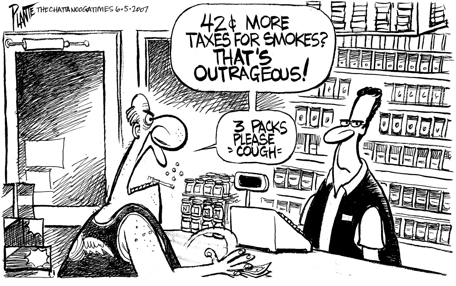 Tags/Keywords Smoking, Tennessee, Tennessee Cigarette Tax Hike, Tennessee education, Tennessee Schools, FILE: PlantB20070607 Reprint This CartoonBuy A PrintBuy The Original REPRINT THIS CARTOON Fill out the info below and I'll be in touch ASAP Your Name (required) Your Email (required) Details, Print, Digital, Circulation, etc. Please leave this field empty. BUY A PRINT OF THIS CARTOON Fill out the info below and I'll be in touch ASAP Your Name(required) Your Email(required) Details, Number of copies, Questions. Please leave this field empty. BUY THE ORIGINAL Originals may or may not be available. Fill out the info below and I'll be in touch ASAP Your Name (required) Your Email (required) Your Message Please leave this field empty.