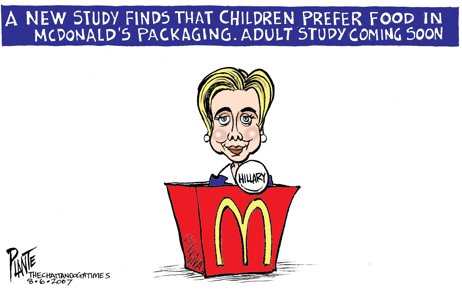 Tags/Keywords Hillary Clinton, McDonald's, McDonald's Marketing, Senator Hillary Clinton, FILE: PlantB20070807 Reprint This CartoonBuy A PrintBuy The Original REPRINT THIS CARTOON Fill out the info below and I'll be in touch ASAP Your Name (required) Your Email (required) Details, Print, Digital, Circulation, etc. Please leave this field empty. BUY A PRINT OF THIS CARTOON Fill out the info below and I'll be in touch ASAP Your Name(required) Your Email(required) Details, Number of copies, Questions. Please leave this field empty. BUY THE ORIGINAL Originals may or may not be available. Fill out the info below and I'll be in touch ASAP Your Name (required) Your Email (required) Your Message Please leave this field empty.