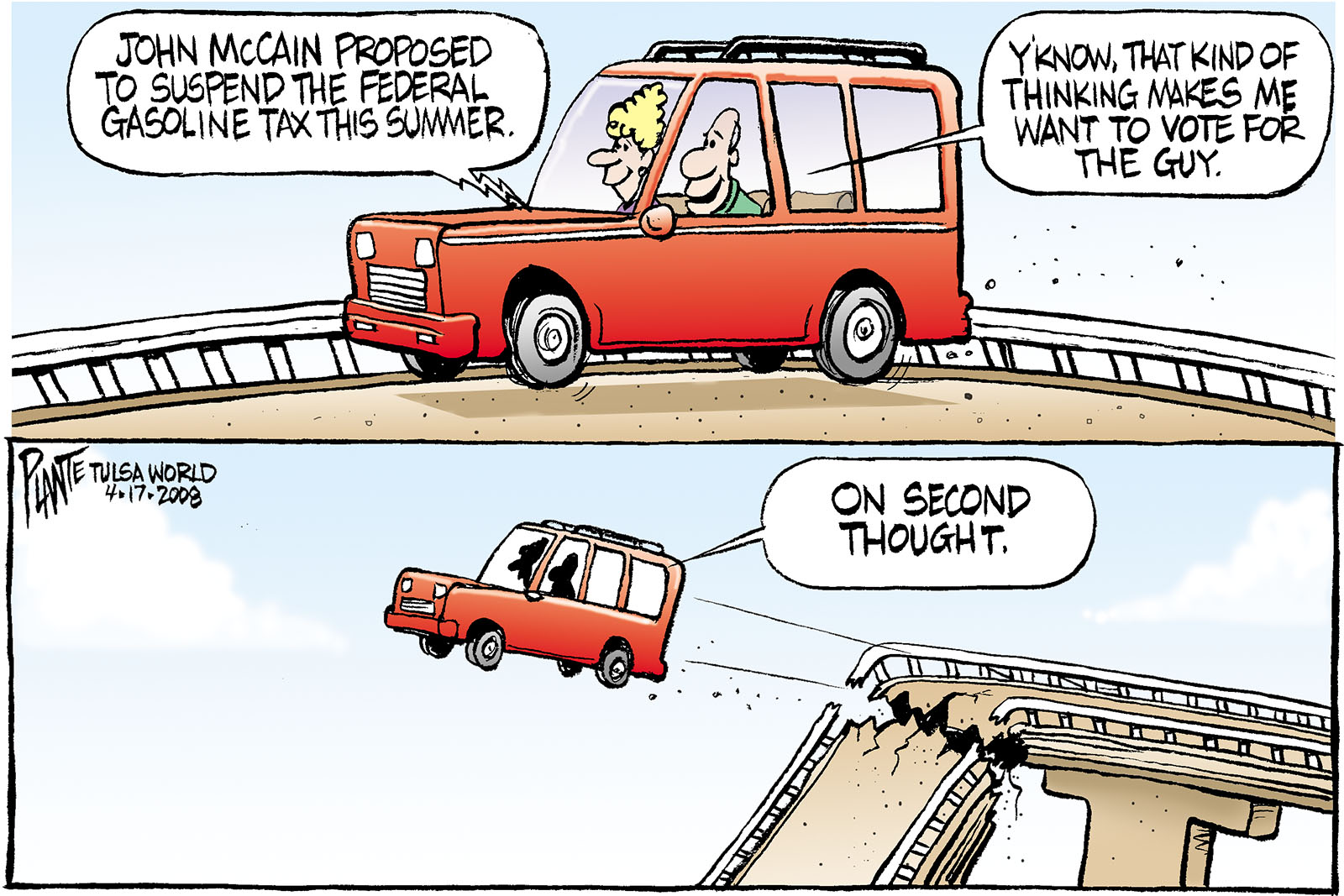 Tags/Keywords bridges, campaign 2008, Election, federal gasoline tax, John McCain, roads, FILE: PlantB20080418 Reprint This CartoonBuy A PrintBuy The Original REPRINT THIS CARTOON Fill out the info below and I'll be in touch ASAP Your Name (required) Your Email (required) Details, Print, Digital, Circulation, etc. Please leave this field empty. BUY A PRINT OF THIS CARTOON Fill out the info below and I'll be in touch ASAP Your Name(required) Your Email(required) Details, Number of copies, Questions. Please leave this field empty. BUY THE ORIGINAL Originals may or may not be available. Fill out the info below and I'll be in touch ASAP Your Name (required) Your Email (required) Your Message Please leave this field empty.