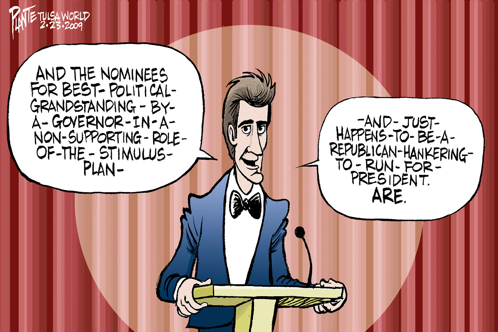 Tags/Keywords And the loser isÉ, Oscars, President Obama, Republican Governors, Stimulus Plan, FILE: PlantB20090224 Reprint This CartoonBuy A PrintBuy The Original REPRINT THIS CARTOON Fill out the info below and I'll be in touch ASAP Your Name (required) Your Email (required) Details, Print, Digital, Circulation, etc. Please leave this field empty. BUY A PRINT OF THIS CARTOON Fill out the info below and I'll be in touch ASAP Your Name(required) Your Email(required) Details, Number of copies, Questions. Please leave this field empty. BUY THE ORIGINAL Originals may or may not be available. Fill out the info below and I'll be in touch ASAP Your Name (required) Your Email (required) Your Message Please leave this field empty.