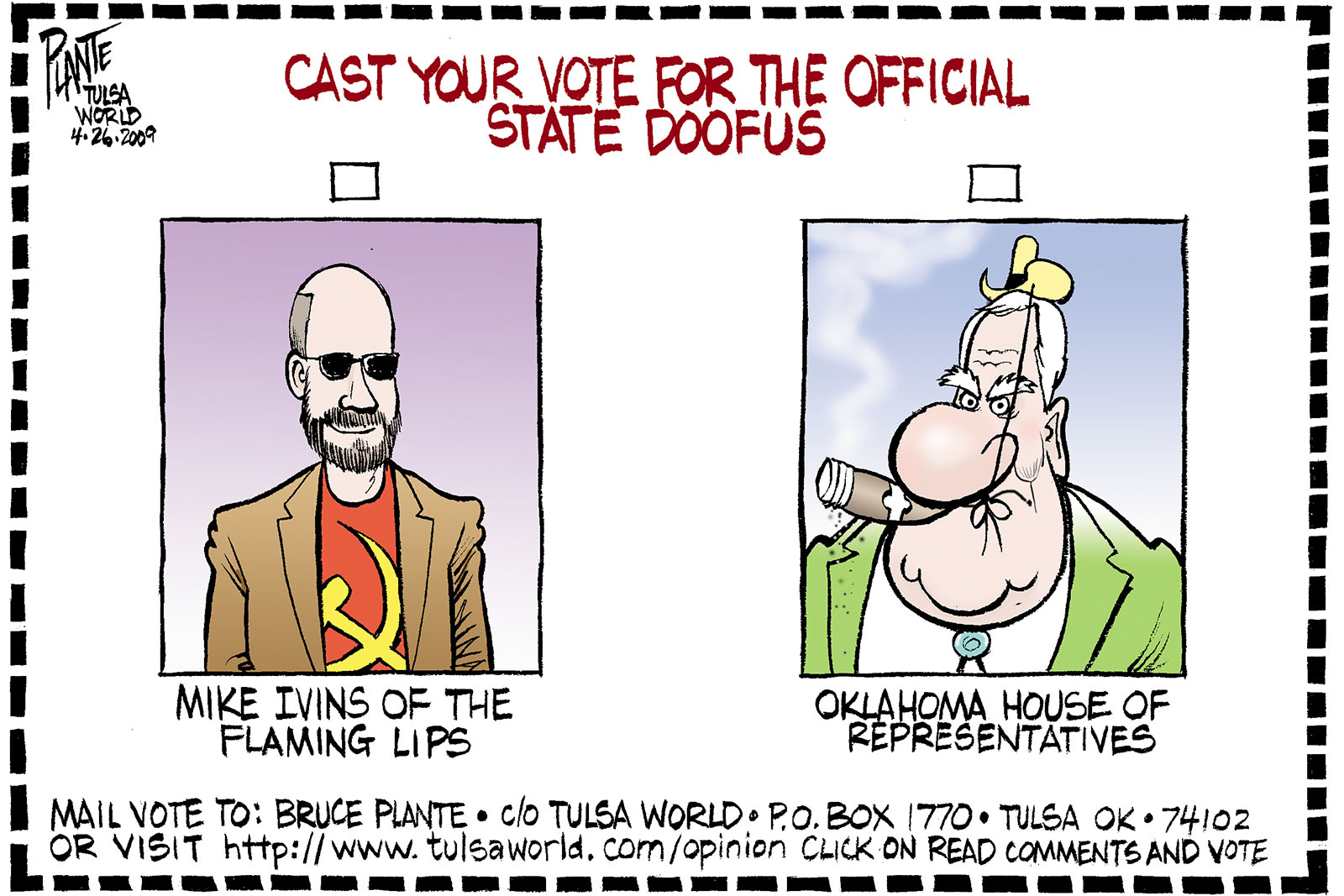 Tags/Keywords Flaming Lips, Mike Ivins, Oklahoma House of Representatives, Oklahoma State Rock'n Roll Song, State Doofus, FILE: PlantB20090426 Reprint This CartoonBuy A PrintBuy The Original REPRINT THIS CARTOON Fill out the info below and I'll be in touch ASAP Your Name (required) Your Email (required) Details, Print, Digital, Circulation, etc. Please leave this field empty. BUY A PRINT OF THIS CARTOON Fill out the info below and I'll be in touch ASAP Your Name(required) Your Email(required) Details, Number of copies, Questions. Please leave this field empty. BUY THE ORIGINAL Originals may or may not be available. Fill out the info below and I'll be in touch ASAP Your Name (required) Your Email (required) Your Message Please leave this field empty.