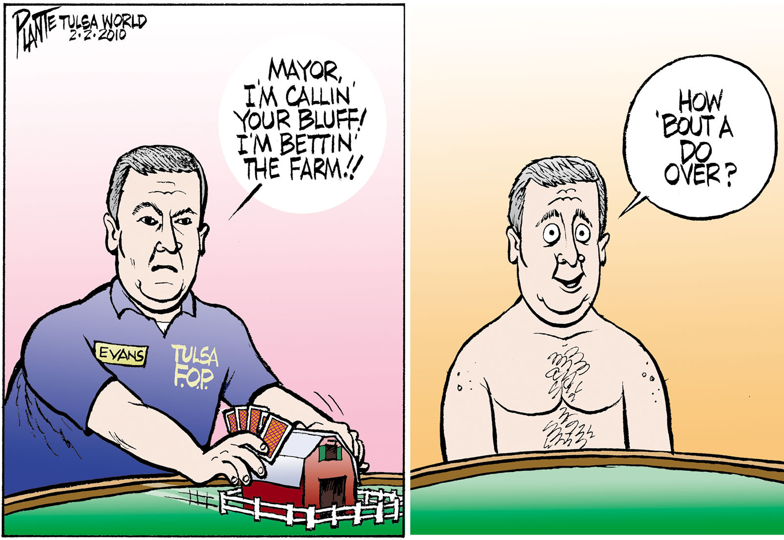 Tags/Keywords Faternal Order of the Police, FOP, FOP Poker, FOP President Phil Evans, Mayor Dewey Bartlett, Police layoffs, Tulsa Budget Crisis, FILE: PlantB20100203 Reprint This CartoonBuy A PrintBuy The Original REPRINT THIS CARTOON Fill out the info below and I'll be in touch ASAP Your Name (required) Your Email (required) Details, Print, Digital, Circulation, etc. Please leave this field empty. BUY A PRINT OF THIS CARTOON Fill out the info below and I'll be in touch ASAP Your Name(required) Your Email(required) Details, Number of copies, Questions. Please leave this field empty. BUY THE ORIGINAL Originals may or may not be available. Fill out the info below and I'll be in touch ASAP Your Name (required) Your Email (required) Your Message Please leave this field empty.