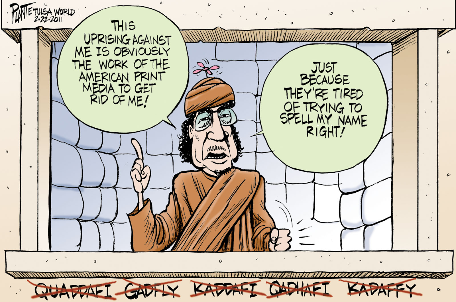 Tags/Keywords Libya, Middle East, Moammar Gadhafi, Muammar Qaddafi, Oil, OPEC, FILE: PlantB20110223 Reprint This CartoonBuy A PrintBuy The Original REPRINT THIS CARTOON Fill out the info below and I'll be in touch ASAP Your Name (required) Your Email (required) Details, Print, Digital, Circulation, etc. Please leave this field empty. BUY A PRINT OF THIS CARTOON Fill out the info below and I'll be in touch ASAP Your Name(required) Your Email(required) Details, Number of copies, Questions. Please leave this field empty. BUY THE ORIGINAL Originals may or may not be available. Fill out the info below and I'll be in touch ASAP Your Name (required) Your Email (required) Your Message Please leave this field empty.