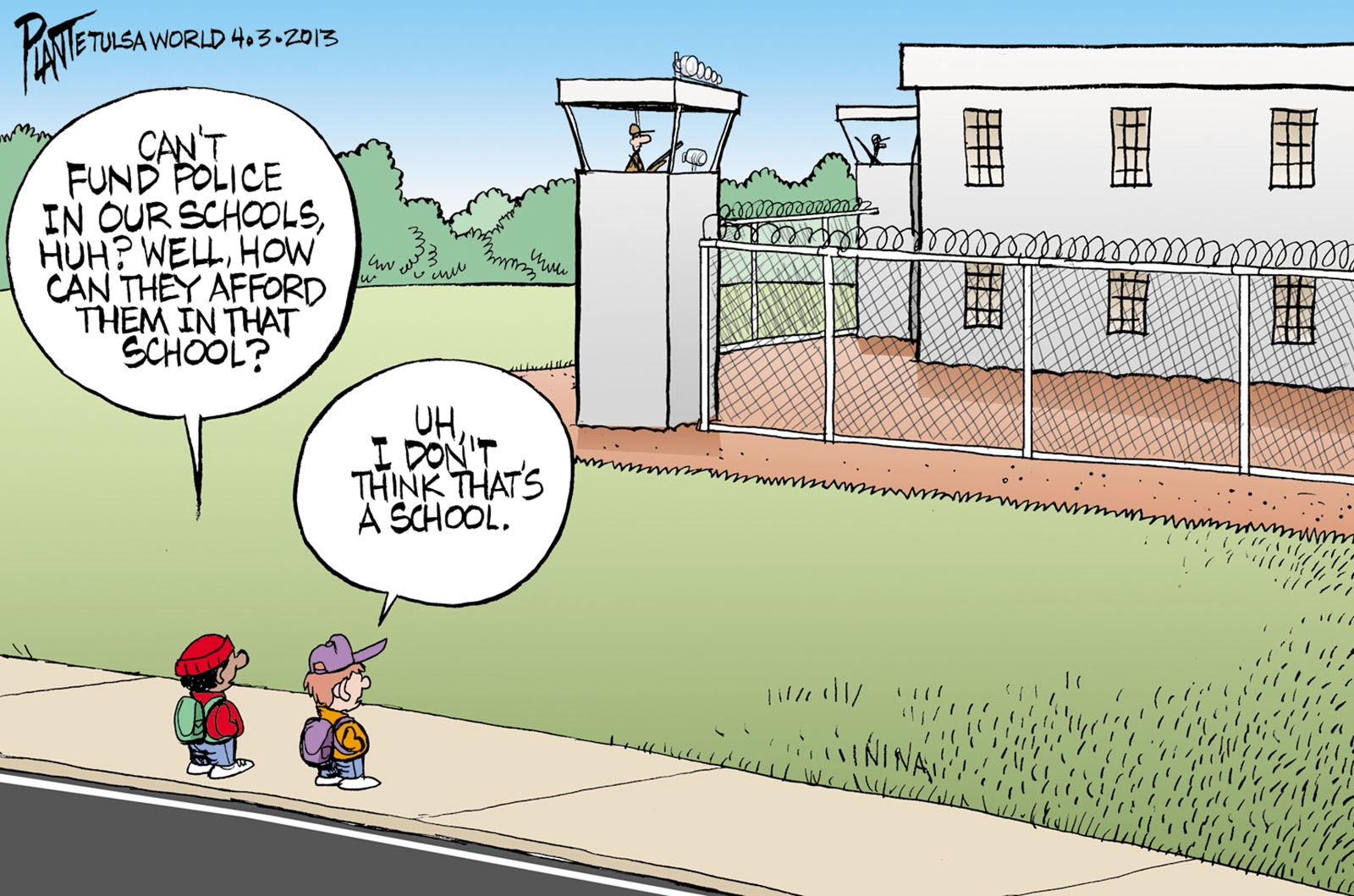 Tags/Keywords Columbine, Newtown, Police in schools, Sandy Hook, school safety, FILE: PlantB20130404 Reprint This CartoonBuy A PrintBuy The Original REPRINT THIS CARTOON Fill out the info below and I'll be in touch ASAP Your Name (required) Your Email (required) Details, Print, Digital, Circulation, etc. Please leave this field empty. BUY A PRINT OF THIS CARTOON Fill out the info below and I'll be in touch ASAP Your Name(required) Your Email(required) Details, Number of copies, Questions. Please leave this field empty. BUY THE ORIGINAL Originals may or may not be available. Fill out the info below and I'll be in touch ASAP Your Name (required) Your Email (required) Your Message Please leave this field empty.