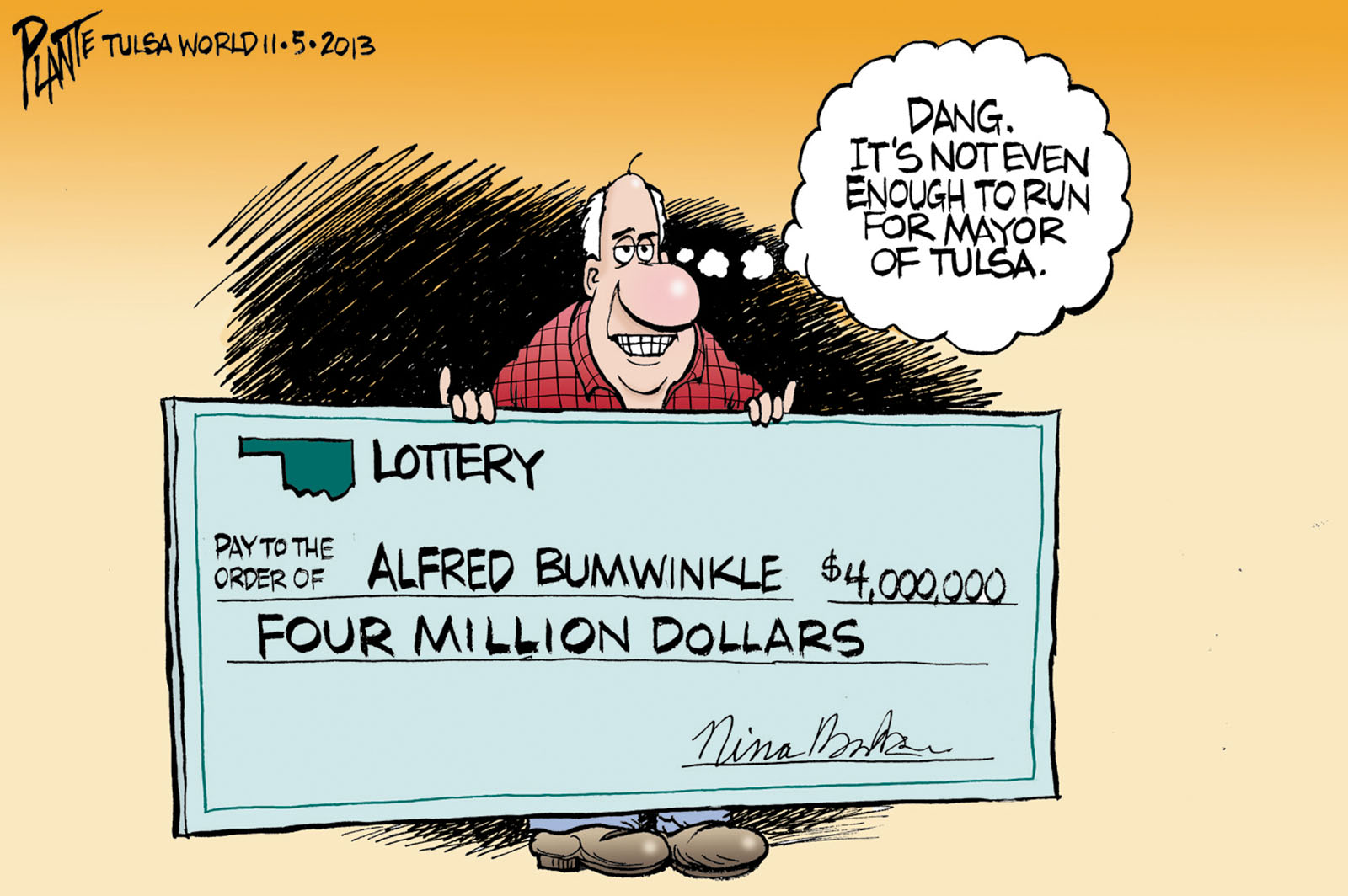 Tags/Keywords Mayor Dewey Bartlett, Mayor Kathy Taylor, mayoral race, Oklahoma, political money, The Tulsa Lottery, Tulsa politics, FILE: PlantB20131106 Reprint This CartoonBuy A PrintBuy The Original REPRINT THIS CARTOON Fill out the info below and I'll be in touch ASAP Your Name (required) Your Email (required) Details, Print, Digital, Circulation, etc. Please leave this field empty. BUY A PRINT OF THIS CARTOON Fill out the info below and I'll be in touch ASAP Your Name(required) Your Email(required) Details, Number of copies, Questions. Please leave this field empty. BUY THE ORIGINAL Originals may or may not be available. Fill out the info below and I'll be in touch ASAP Your Name (required) Your Email (required) Your Message Please leave this field empty.