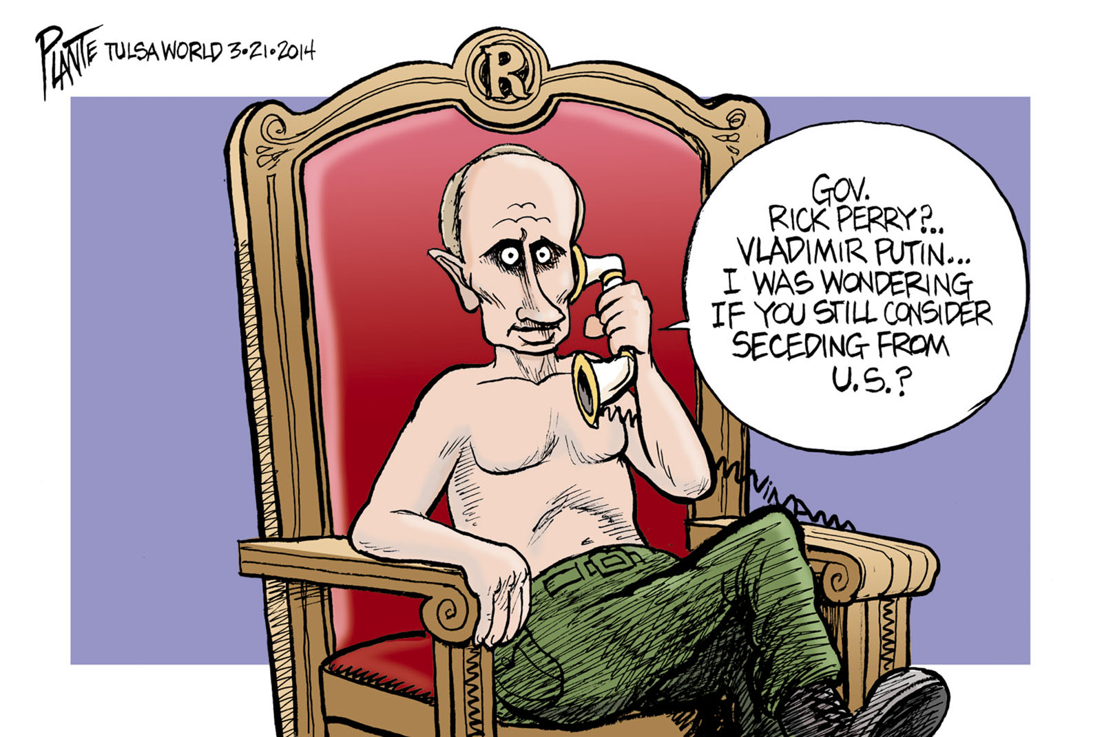 Tags/Keywords Crimea, Putin on the horn, Russia, seceding, Texas Governor Rick Perry, Texas secession, Ukraine, FILE: PlantB20140323A Reprint This CartoonBuy A PrintBuy The Original REPRINT THIS CARTOON Fill out the info below and I'll be in touch ASAP Your Name (required) Your Email (required) Details, Print, Digital, Circulation, etc. Please leave this field empty. BUY A PRINT OF THIS CARTOON Fill out the info below and I'll be in touch ASAP Your Name(required) Your Email(required) Details, Number of copies, Questions. Please leave this field empty. BUY THE ORIGINAL Originals may or may not be available. Fill out the info below and I'll be in touch ASAP Your Name (required) Your Email (required) Your Message Please leave this field empty.