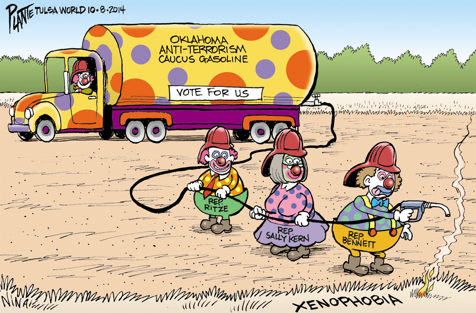 Tags/Keywords Fanning the Flames, Islam, Muslim, Oklahoma Anti-terrorism Caucus, Oklahoma House of Representative, Rep. John Bennett, Rep. Mike Ritze, Rep. Sally Kern, xenophobia, FILE: PlantB20141009 Reprint This CartoonBuy A PrintBuy The Original REPRINT THIS CARTOON Fill out the info below and I'll be in touch ASAP Your Name (required) Your Email (required) Details, Print, Digital, Circulation, etc. Please leave this field empty. BUY A PRINT OF THIS CARTOON Fill out the info below and I'll be in touch ASAP Your Name(required) Your Email(required) Details, Number of copies, Questions. Please leave this field empty. BUY THE ORIGINAL Originals may or may not be available. Fill out the info below and I'll be in touch ASAP Your Name (required) Your Email (required) Your Message Please leave this field empty.