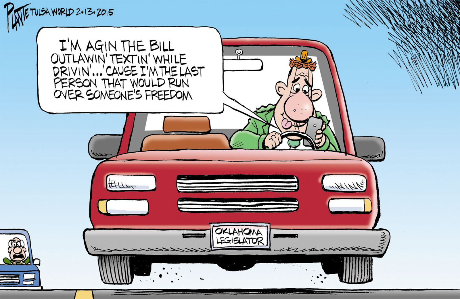Tags/Keywords distracted driving, freedom, head-on wreck, Oklahoma's legislation to outlaw texting w, FILE: PlantB20150215 Reprint This CartoonBuy A PrintBuy The Original REPRINT THIS CARTOON Fill out the info below and I'll be in touch ASAP Your Name (required) Your Email (required) Details, Print, Digital, Circulation, etc. Please leave this field empty. BUY A PRINT OF THIS CARTOON Fill out the info below and I'll be in touch ASAP Your Name(required) Your Email(required) Details, Number of copies, Questions. Please leave this field empty. BUY THE ORIGINAL Originals may or may not be available. Fill out the info below and I'll be in touch ASAP Your Name (required) Your Email (required) Your Message Please leave this field empty.