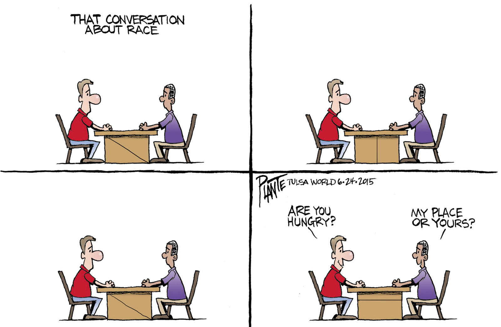 Tags/Keywords breaking bread, race relations, social interaction, That conversation about race, FILE: PlantB20150625 Reprint This CartoonBuy A PrintBuy The Original REPRINT THIS CARTOON Fill out the info below and I'll be in touch ASAP Your Name (required) Your Email (required) Details, Print, Digital, Circulation, etc. Please leave this field empty. BUY A PRINT OF THIS CARTOON Fill out the info below and I'll be in touch ASAP Your Name(required) Your Email(required) Details, Number of copies, Questions. Please leave this field empty. BUY THE ORIGINAL Originals may or may not be available. Fill out the info below and I'll be in touch ASAP Your Name (required) Your Email (required) Your Message Please leave this field empty.