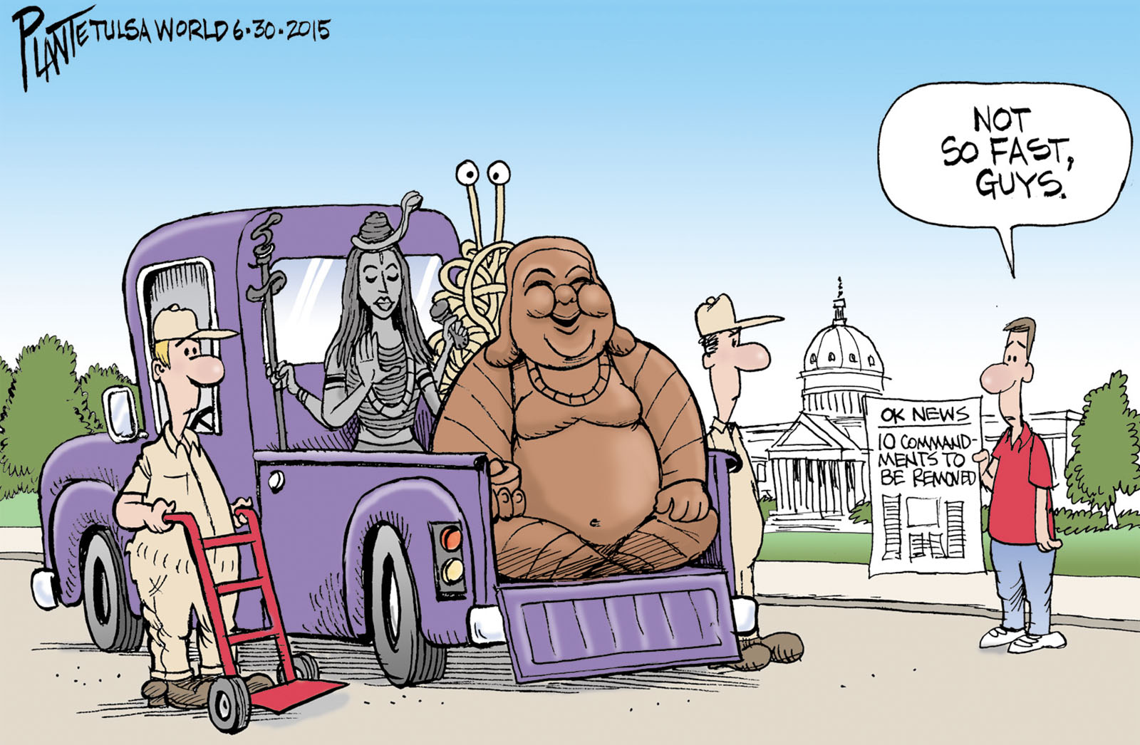 Tags/Keywords OK Ten Commandments Monument ruling, Oklahoma City, Oklahoma Constitution, Oklahoma Supreme Court, separation of religion and state, FILE: PlantB20150701 Reprint This CartoonBuy A PrintBuy The Original REPRINT THIS CARTOON Fill out the info below and I'll be in touch ASAP Your Name (required) Your Email (required) Details, Print, Digital, Circulation, etc. Please leave this field empty. BUY A PRINT OF THIS CARTOON Fill out the info below and I'll be in touch ASAP Your Name(required) Your Email(required) Details, Number of copies, Questions. Please leave this field empty. BUY THE ORIGINAL Originals may or may not be available. Fill out the info below and I'll be in touch ASAP Your Name (required) Your Email (required) Your Message Please leave this field empty.