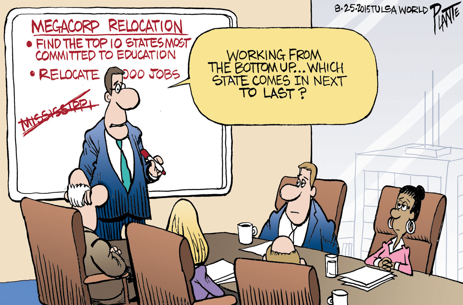 Tags/Keywords commitment to education, Education, job growth, MegaCorp relocation, Mississippi, OK teachers pay, Oklahoma Public schools, FILE: PlantB20150826 Reprint This CartoonBuy A PrintBuy The Original REPRINT THIS CARTOON Fill out the info below and I'll be in touch ASAP Your Name (required) Your Email (required) Details, Print, Digital, Circulation, etc. Please leave this field empty. BUY A PRINT OF THIS CARTOON Fill out the info below and I'll be in touch ASAP Your Name(required) Your Email(required) Details, Number of copies, Questions. Please leave this field empty. BUY THE ORIGINAL Originals may or may not be available. Fill out the info below and I'll be in touch ASAP Your Name (required) Your Email (required) Your Message Please leave this field empty.
