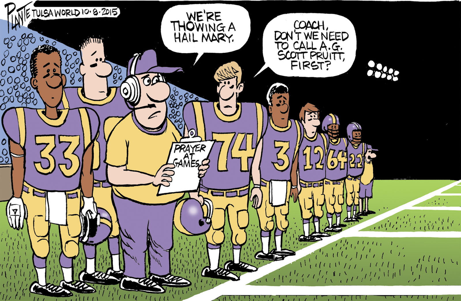 Tags/Keywords Oklahoma Attorney General Scott Pruitt, Oklahoma Secondary School Athletic Association, OSSAA, Prayer at high school football games, FILE: PlantB20151010 Reprint This CartoonBuy A PrintBuy The Original REPRINT THIS CARTOON Fill out the info below and I'll be in touch ASAP Your Name (required) Your Email (required) Details, Print, Digital, Circulation, etc. Please leave this field empty. BUY A PRINT OF THIS CARTOON Fill out the info below and I'll be in touch ASAP Your Name(required) Your Email(required) Details, Number of copies, Questions. Please leave this field empty. BUY THE ORIGINAL Originals may or may not be available. Fill out the info below and I'll be in touch ASAP Your Name (required) Your Email (required) Your Message Please leave this field empty.