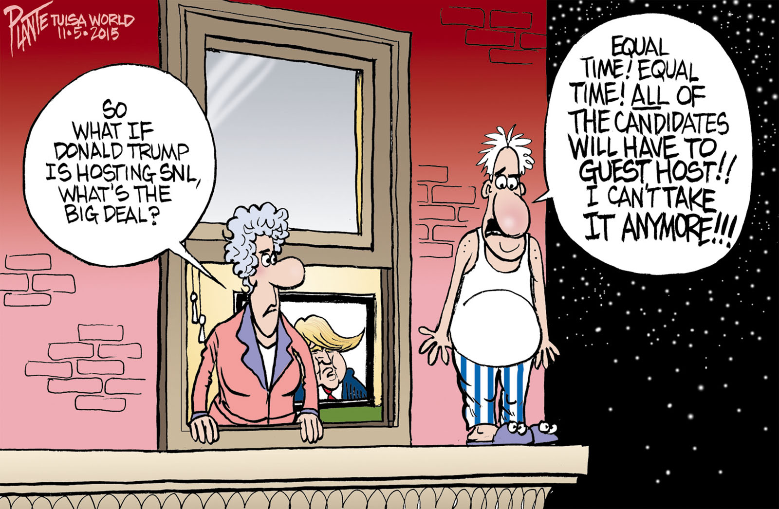 Tags/Keywords Donald Trump, GOP, Live from New York, Live from New York it's Saturday Night!, NBC, Republican Presidential Primary Campaign 2016, RNC, Saturday Night Live, SNL, FILE: PlantB20151106 Reprint This CartoonBuy A PrintBuy The Original REPRINT THIS CARTOON Fill out the info below and I'll be in touch ASAP Your Name (required) Your Email (required) Details, Print, Digital, Circulation, etc. Please leave this field empty. BUY A PRINT OF THIS CARTOON Fill out the info below and I'll be in touch ASAP Your Name(required) Your Email(required) Details, Number of copies, Questions. Please leave this field empty. BUY THE ORIGINAL Originals may or may not be available. Fill out the info below and I'll be in touch ASAP Your Name (required) Your Email (required) Your Message Please leave this field empty.