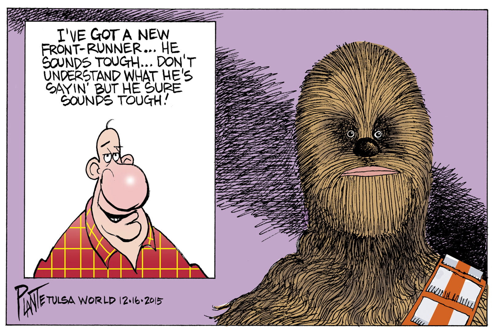 Tags/Keywords carpet-bombing, Chewbacca, CNN, GOP, Republican Primary Debates 2016, RNC, Sen.Ted Cruz, Star Wars, The New front-runner, tough talk, FILE: PlantB20151217 Reprint This CartoonBuy A PrintBuy The Original REPRINT THIS CARTOON Fill out the info below and I'll be in touch ASAP Your Name (required) Your Email (required) Details, Print, Digital, Circulation, etc. Please leave this field empty. BUY A PRINT OF THIS CARTOON Fill out the info below and I'll be in touch ASAP Your Name(required) Your Email(required) Details, Number of copies, Questions. Please leave this field empty. BUY THE ORIGINAL Originals may or may not be available. Fill out the info below and I'll be in touch ASAP Your Name (required) Your Email (required) Your Message Please leave this field empty.