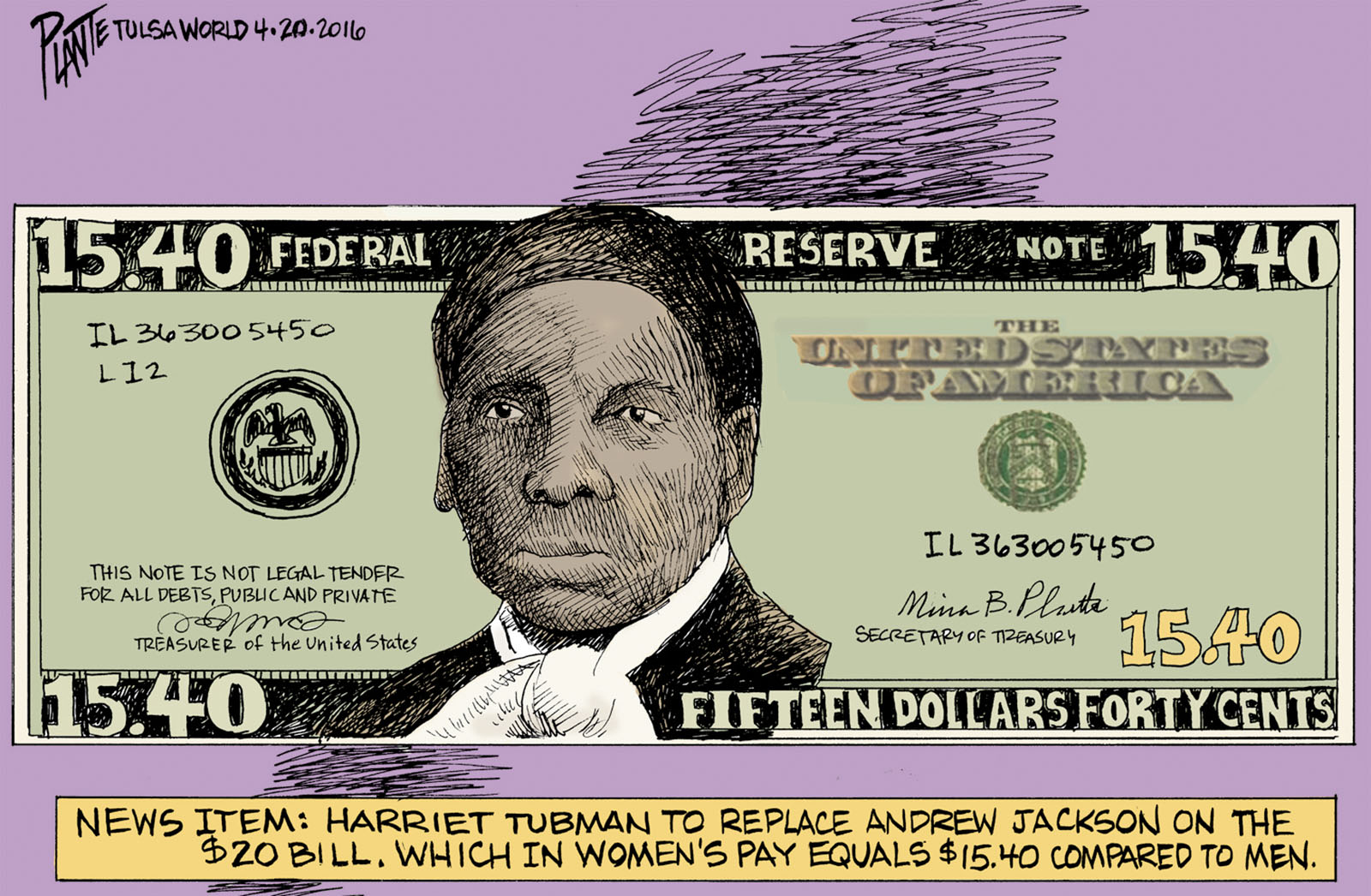 Tags/Keywords 20 dollar bill, Harriet Tubman, President Andrew Jackson, Secretary of Treasury Jack Lew, FILE: PlantB20160421 Reprint This CartoonBuy A PrintBuy The Original REPRINT THIS CARTOON Fill out the info below and I'll be in touch ASAP Your Name (required) Your Email (required) Details, Print, Digital, Circulation, etc. Please leave this field empty. BUY A PRINT OF THIS CARTOON Fill out the info below and I'll be in touch ASAP Your Name(required) Your Email(required) Details, Number of copies, Questions. Please leave this field empty. BUY THE ORIGINAL Originals may or may not be available. Fill out the info below and I'll be in touch ASAP Your Name (required) Your Email (required) Your Message Please leave this field empty.