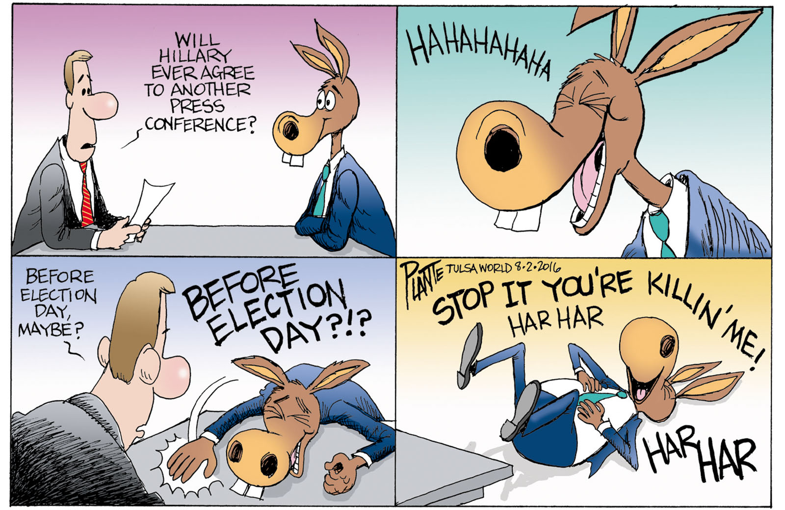 Tags/Keywords Democratic Party, Democratic Presidential Candidate 2016, DNC, Hillary and Press Conferences, press corp, Secretary Hillary Clinton, the fourth estate, FILE: PlantB20160803 Reprint This CartoonBuy A PrintBuy The Original REPRINT THIS CARTOON Fill out the info below and I'll be in touch ASAP Your Name (required) Your Email (required) Details, Print, Digital, Circulation, etc. Please leave this field empty. BUY A PRINT OF THIS CARTOON Fill out the info below and I'll be in touch ASAP Your Name(required) Your Email(required) Details, Number of copies, Questions. Please leave this field empty. BUY THE ORIGINAL Originals may or may not be available. Fill out the info below and I'll be in touch ASAP Your Name (required) Your Email (required) Your Message Please leave this field empty.