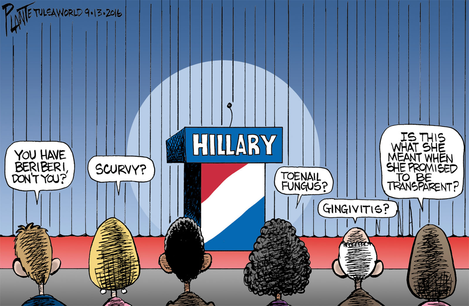 Tags/Keywords Democratic Party, Democratic Presidential Candidate 2016, DNC, Hillary Illary, HRC, pneumonia, Presidential campaign 2016, Secretary Hillary Clinton, FILE: PlantB20160914 Reprint This CartoonBuy A PrintBuy The Original REPRINT THIS CARTOON Fill out the info below and I'll be in touch ASAP Your Name (required) Your Email (required) Details, Print, Digital, Circulation, etc. Please leave this field empty. BUY A PRINT OF THIS CARTOON Fill out the info below and I'll be in touch ASAP Your Name(required) Your Email(required) Details, Number of copies, Questions. Please leave this field empty. BUY THE ORIGINAL Originals may or may not be available. Fill out the info below and I'll be in touch ASAP Your Name (required) Your Email (required) Your Message Please leave this field empty.