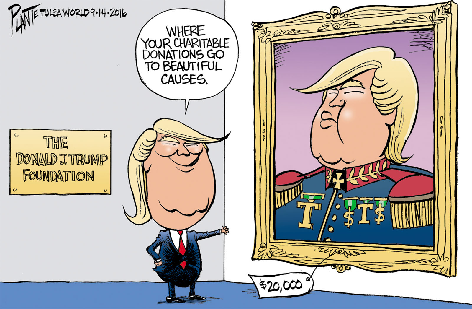 Tags/Keywords Donald J. Trump Foundation, GOP, Presidential campaign 2016, Republican Party, Republican Presidential Candidate 2016, RNC, FILE: PlantB20160915 Reprint This CartoonBuy A PrintBuy The Original REPRINT THIS CARTOON Fill out the info below and I'll be in touch ASAP Your Name (required) Your Email (required) Details, Print, Digital, Circulation, etc. Please leave this field empty. BUY A PRINT OF THIS CARTOON Fill out the info below and I'll be in touch ASAP Your Name(required) Your Email(required) Details, Number of copies, Questions. Please leave this field empty. BUY THE ORIGINAL Originals may or may not be available. Fill out the info below and I'll be in touch ASAP Your Name (required) Your Email (required) Your Message Please leave this field empty.