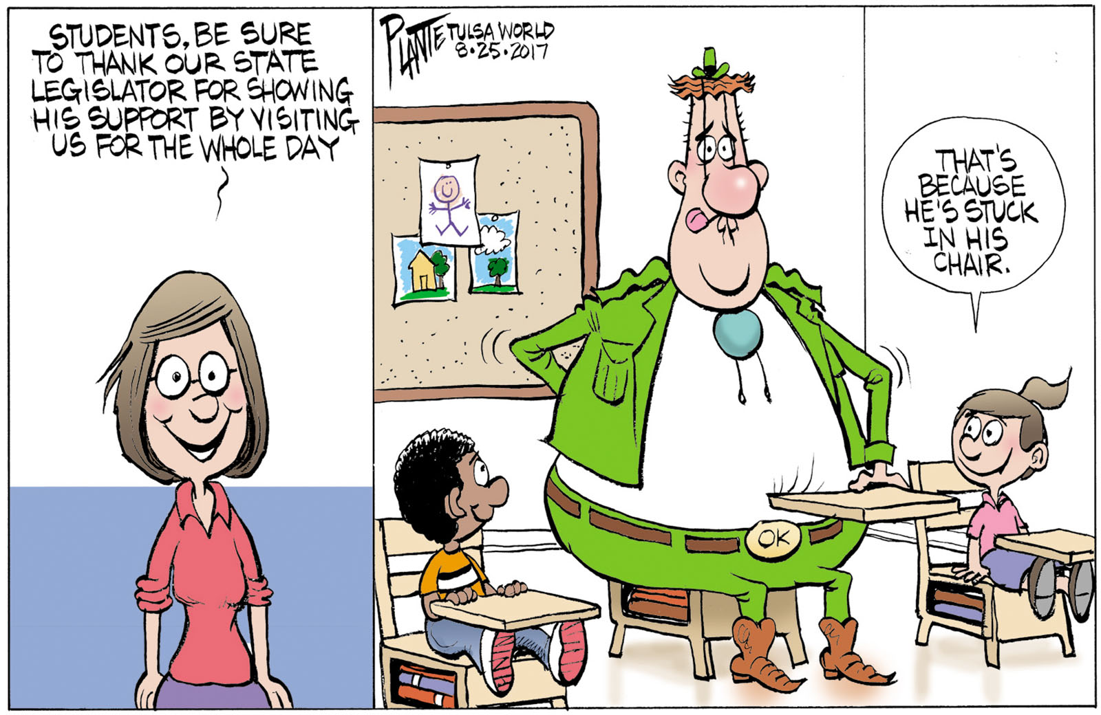 Tags/Keywords OK Legislator visits school, Oklahoma Legislature budget mistakes, teacher shortage, FILE: PlantB20170826 Reprint This CartoonBuy A PrintBuy The Original REPRINT THIS CARTOON Fill out the info below and I'll be in touch ASAP Your Name (required) Your Email (required) Details, Print, Digital, Circulation, etc. Please leave this field empty. BUY A PRINT OF THIS CARTOON Fill out the info below and I'll be in touch ASAP Your Name(required) Your Email(required) Details, Number of copies, Questions. Please leave this field empty. BUY THE ORIGINAL Originals may or may not be available. Fill out the info below and I'll be in touch ASAP Your Name (required) Your Email (required) Your Message Please leave this field empty.