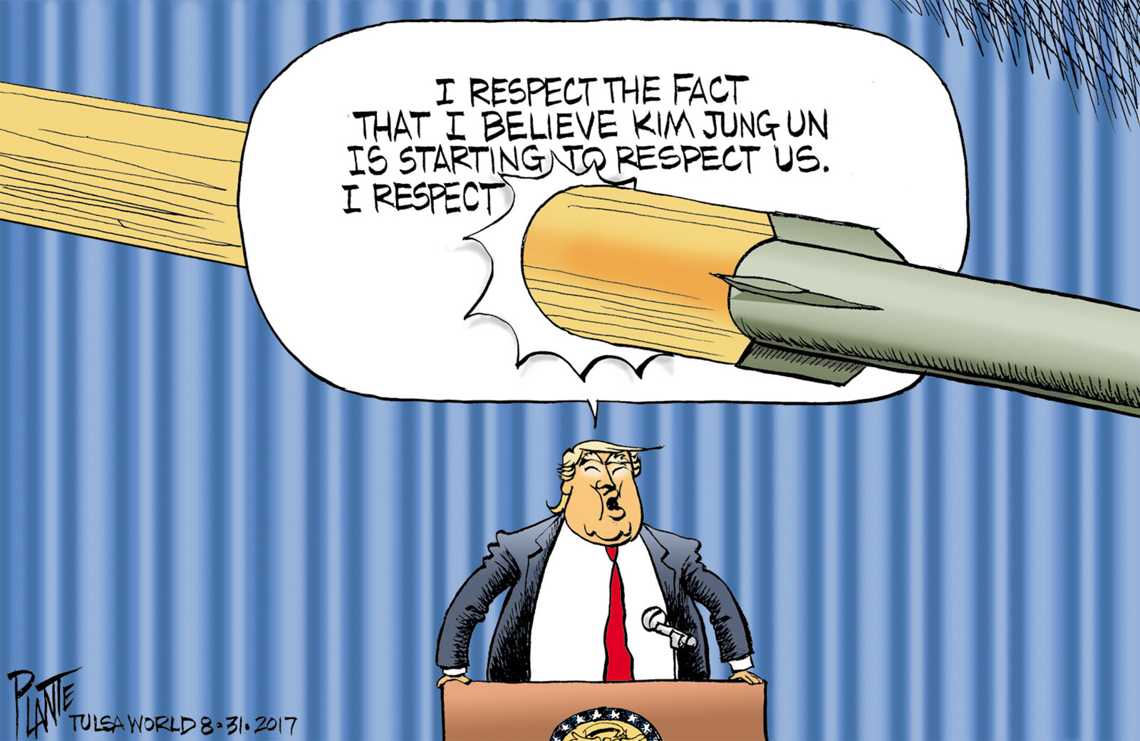 Tags/Keywords ballistic missile, China, North Korean Dictator Kim Jung Un, nuclear power, President Donald J. Trump, Trump respects Kim Jong Un, United Nations, United States, FILE: PlantB20170901 Reprint This CartoonBuy A PrintBuy The Original REPRINT THIS CARTOON Fill out the info below and I'll be in touch ASAP Your Name (required) Your Email (required) Details, Print, Digital, Circulation, etc. Please leave this field empty. BUY A PRINT OF THIS CARTOON Fill out the info below and I'll be in touch ASAP Your Name(required) Your Email(required) Details, Number of copies, Questions. Please leave this field empty. BUY THE ORIGINAL Originals may or may not be available. Fill out the info below and I'll be in touch ASAP Your Name (required) Your Email (required) Your Message Please leave this field empty.