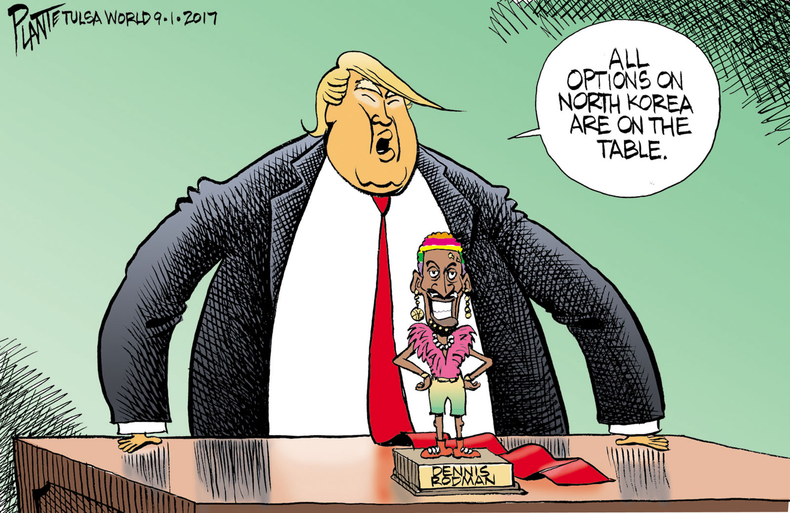 Tags/Keywords All options are on the table', Dennis Rodman, no good military option, North Korean Dictator Kim Jung Un, opinionh, President Donald J. Trump, Trump's Options, FILE: PlantB20170903 Reprint This CartoonBuy A PrintBuy The Original REPRINT THIS CARTOON Fill out the info below and I'll be in touch ASAP Your Name (required) Your Email (required) Details, Print, Digital, Circulation, etc. Please leave this field empty. BUY A PRINT OF THIS CARTOON Fill out the info below and I'll be in touch ASAP Your Name(required) Your Email(required) Details, Number of copies, Questions. Please leave this field empty. BUY THE ORIGINAL Originals may or may not be available. Fill out the info below and I'll be in touch ASAP Your Name (required) Your Email (required) Your Message Please leave this field empty.