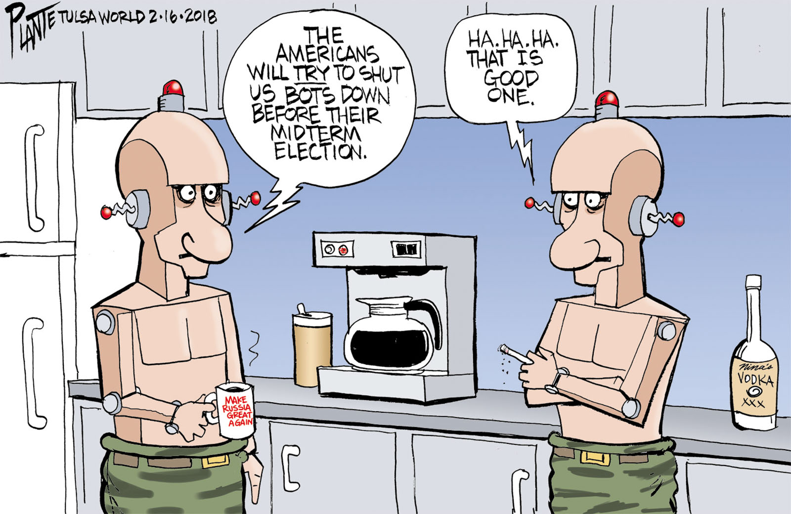 Tags/Keywords 13 indictments on Russians, C.I.A., dividing America, F.B. I., misleading Americans, More Russian bots, N.S.A., opinionhomepage1, President Vladimir Putin, Russian meddling, FILE: PlantB20180218 Reprint This CartoonBuy A PrintBuy The Original REPRINT THIS CARTOON Fill out the info below and I'll be in touch ASAP Your Name (required) Your Email (required) Details, Print, Digital, Circulation, etc. Please leave this field empty. BUY A PRINT OF THIS CARTOON Fill out the info below and I'll be in touch ASAP Your Name(required) Your Email(required) Details, Number of copies, Questions. Please leave this field empty. BUY THE ORIGINAL Originals may or may not be available. Fill out the info below and I'll be in touch ASAP Your Name (required) Your Email (required) Your Message Please leave this field empty.