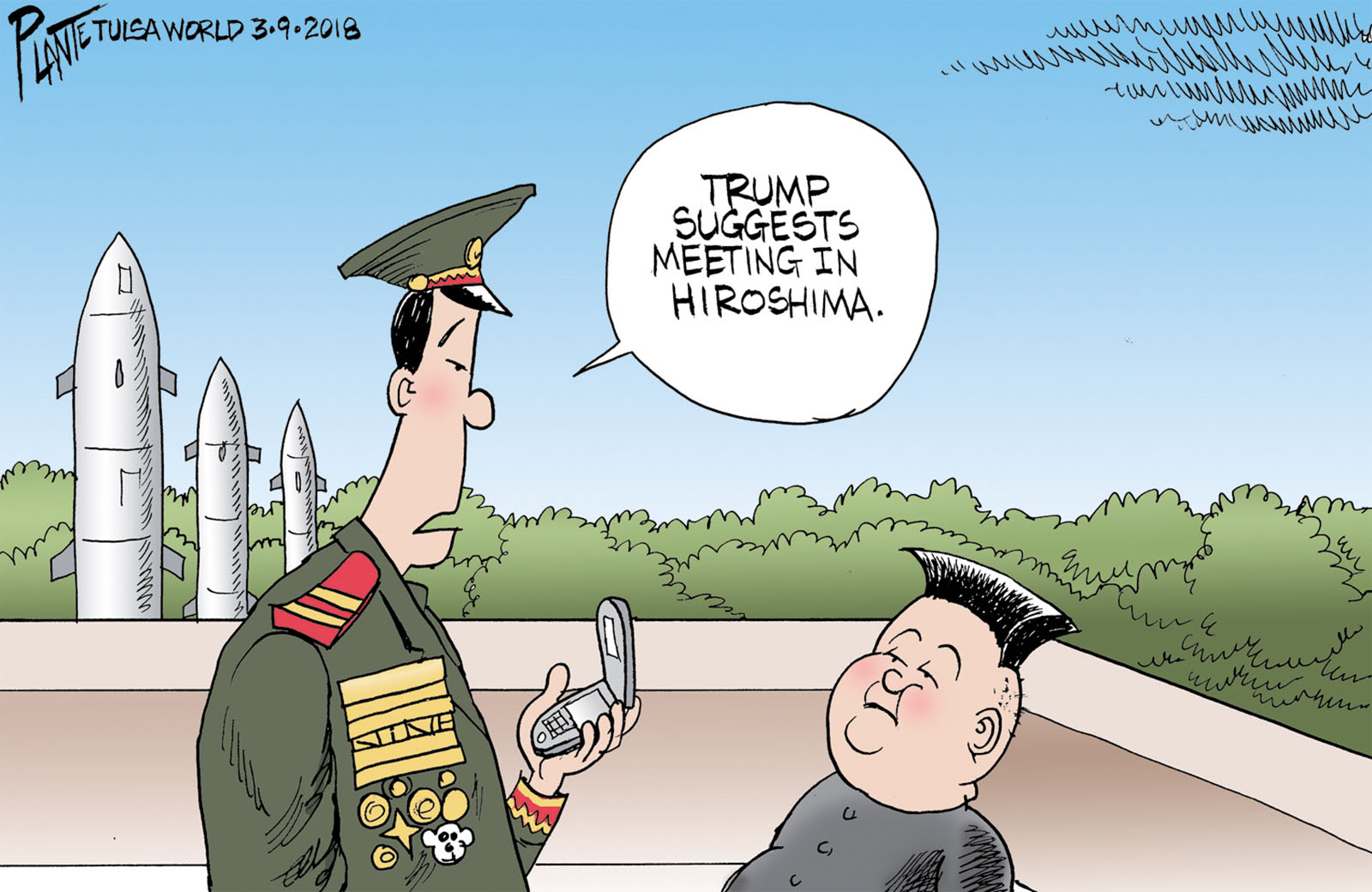 Tags/Keywords Hiroshima, North Korea's Dictator Kim Jong Un, nuclear warfare, opinionhomepage1, President Donald J. Trump, Where will Trump meet with Kim Jong Un?, FILE: PlantB20180311 Reprint This CartoonBuy A PrintBuy The Original REPRINT THIS CARTOON Fill out the info below and I'll be in touch ASAP Your Name (required) Your Email (required) Details, Print, Digital, Circulation, etc. Please leave this field empty. BUY A PRINT OF THIS CARTOON Fill out the info below and I'll be in touch ASAP Your Name(required) Your Email(required) Details, Number of copies, Questions. Please leave this field empty. BUY THE ORIGINAL Originals may or may not be available. Fill out the info below and I'll be in touch ASAP Your Name (required) Your Email (required) Your Message Please leave this field empty.