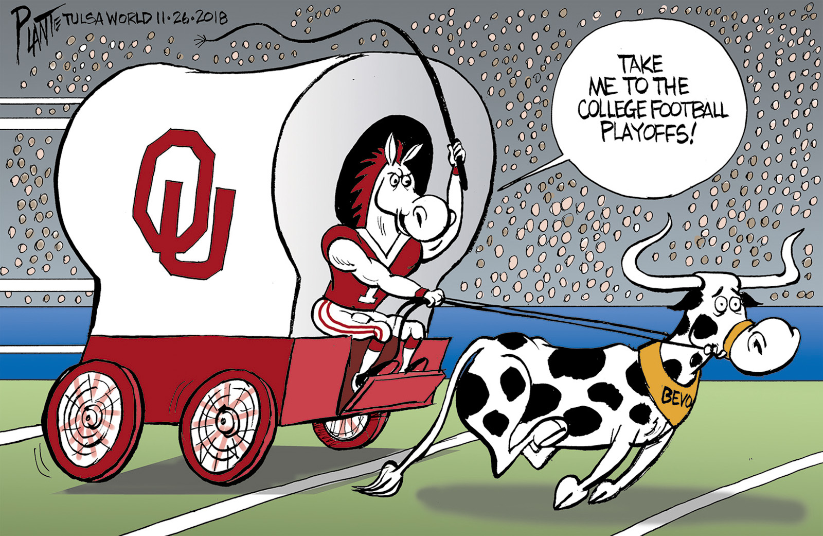 Tags/Keywords Arlington Texas, AT&T Stadium, BCS, Big 12 Championship Game, Bowl Championship Series, College Football Playoffs, Oklahoma Sooners vs. Texas Longhorns, Top 4, FILE: Plante20181127 Reprint This CartoonBuy A PrintBuy The Original REPRINT THIS CARTOON Fill out the info below and I'll be in touch ASAP Your Name (required) Your Email (required) Details, Print, Digital, Circulation, etc. Please leave this field empty. BUY A PRINT OF THIS CARTOON Fill out the info below and I'll be in touch ASAP Your Name(required) Your Email(required) Details, Number of copies, Questions. Please leave this field empty. BUY THE ORIGINAL Originals may or may not be available. Fill out the info below and I'll be in touch ASAP Your Name (required) Your Email (required) Your Message Please leave this field empty.