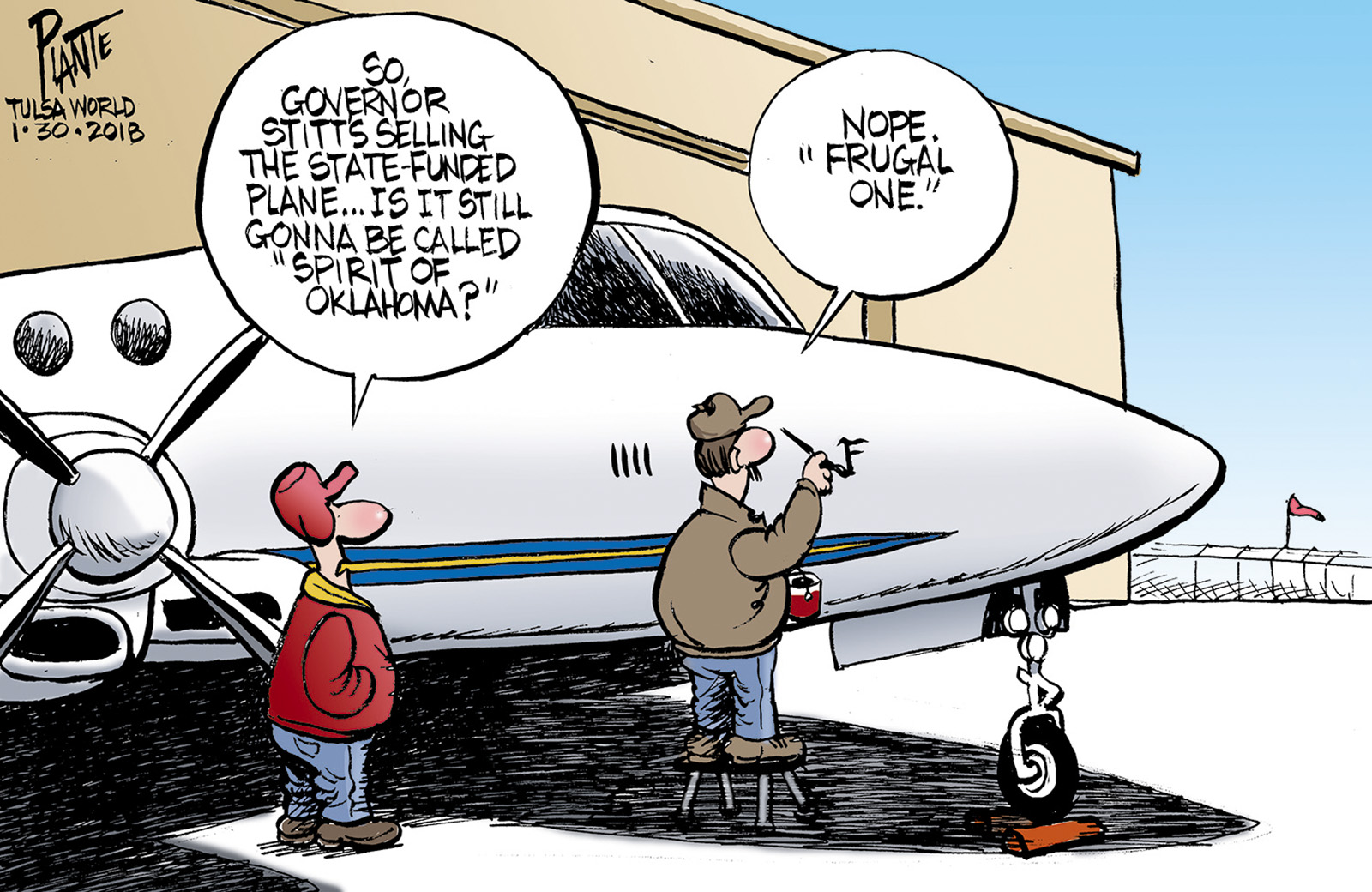 Tags/Keywords executive order, Governor Kevin Stitt, OK, sells state plane, Spirit of Oklahoma, FILE: Plante20190131 Reprint This CartoonBuy A PrintBuy The Original REPRINT THIS CARTOON Fill out the info below and I'll be in touch ASAP Your Name (required) Your Email (required) Details, Print, Digital, Circulation, etc. Please leave this field empty. BUY A PRINT OF THIS CARTOON Fill out the info below and I'll be in touch ASAP Your Name(required) Your Email(required) Details, Number of copies, Questions. Please leave this field empty. BUY THE ORIGINAL Originals may or may not be available. Fill out the info below and I'll be in touch ASAP Your Name (required) Your Email (required) Your Message Please leave this field empty.