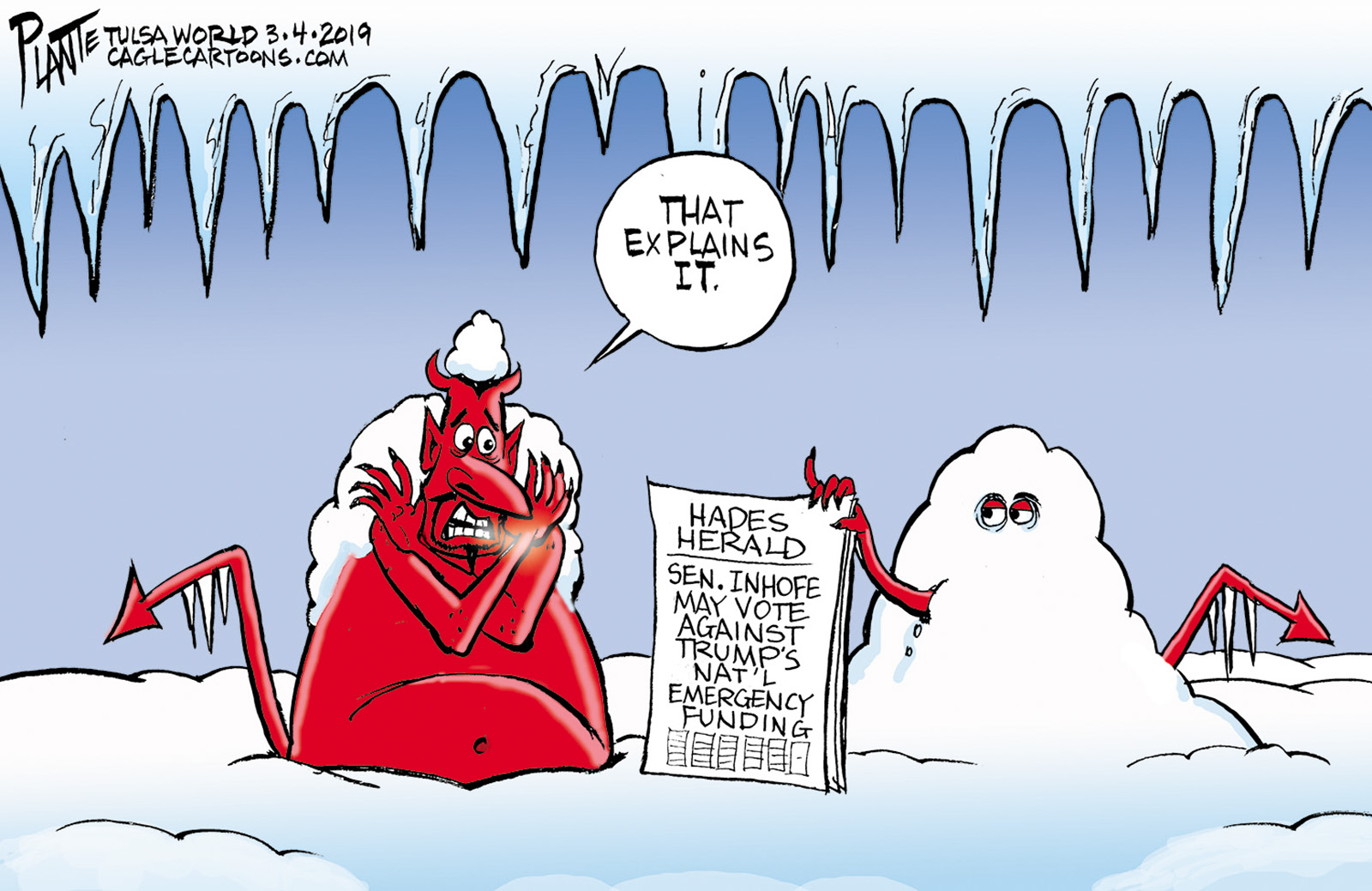 Tags/Keywords Hades Herald, Hell freezing over, President Donald J. Trump, Trump and Senator Inhofe, U.S. Senator Jim Inhofe-OK-R, FILE: Plante20190305 Reprint This CartoonBuy A PrintBuy The Original REPRINT THIS CARTOON Fill out the info below and I'll be in touch ASAP Your Name (required) Your Email (required) Details, Print, Digital, Circulation, etc. Please leave this field empty. BUY A PRINT OF THIS CARTOON Fill out the info below and I'll be in touch ASAP Your Name(required) Your Email(required) Details, Number of copies, Questions. Please leave this field empty. BUY THE ORIGINAL Originals may or may not be available. Fill out the info below and I'll be in touch ASAP Your Name (required) Your Email (required) Your Message Please leave this field empty.