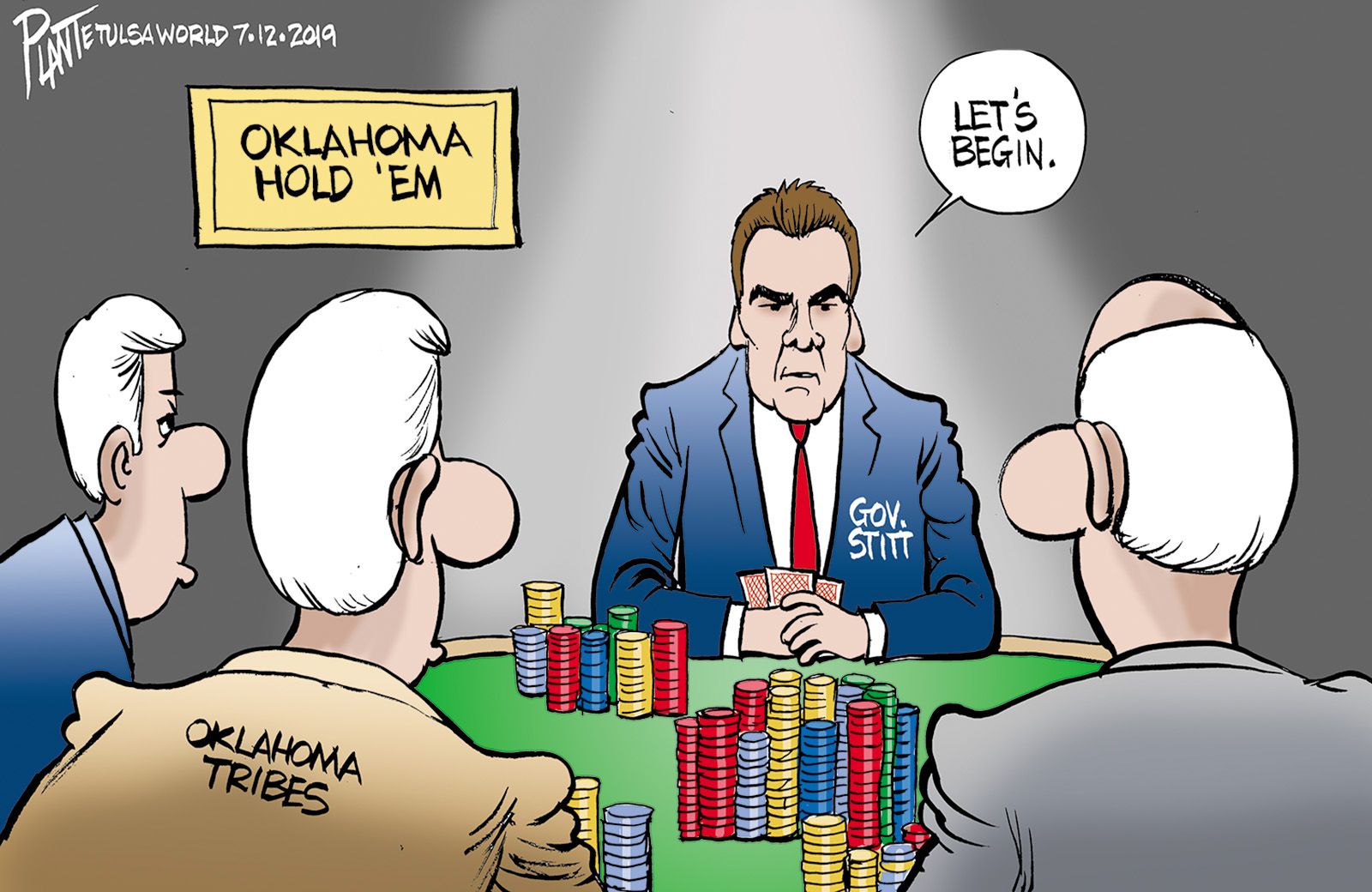 Tags/Keywords Choctaw, Creek and Seminole nations and the governor of the Chickasaws, Oklahoma Governor Kevin Stitt, Oklahoma hold 'em, renegotiating gaming compacts, the chiefs of the Cherokee, the Inter-Tribal Council of the Five Civilized Tribes, FILE: Plante20190713 Reprint This CartoonBuy A PrintBuy The Original REPRINT THIS CARTOON Fill out the info below and I'll be in touch ASAP Your Name (required) Your Email (required) Details, Print, Digital, Circulation, etc. Please leave this field empty. BUY A PRINT OF THIS CARTOON Fill out the info below and I'll be in touch ASAP Your Name(required) Your Email(required) Details, Number of copies, Questions. Please leave this field empty. BUY THE ORIGINAL Originals may or may not be available. Fill out the info below and I'll be in touch ASAP Your Name (required) Your Email (required) Your Message Please leave this field empty.