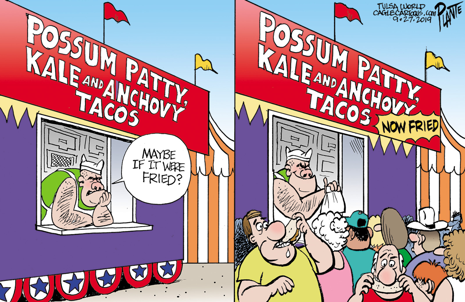 Tags/Keywords fried food, kale and anchovy tacos, possum patty, State Fair Food, Tulsa State Fair, FILE: Plante20190929 Reprint This CartoonBuy A PrintBuy The Original REPRINT THIS CARTOON Fill out the info below and I'll be in touch ASAP Your Name (required) Your Email (required) Details, Print, Digital, Circulation, etc. Please leave this field empty. BUY A PRINT OF THIS CARTOON Fill out the info below and I'll be in touch ASAP Your Name(required) Your Email(required) Details, Number of copies, Questions. Please leave this field empty. BUY THE ORIGINAL Originals may or may not be available. Fill out the info below and I'll be in touch ASAP Your Name (required) Your Email (required) Your Message Please leave this field empty.