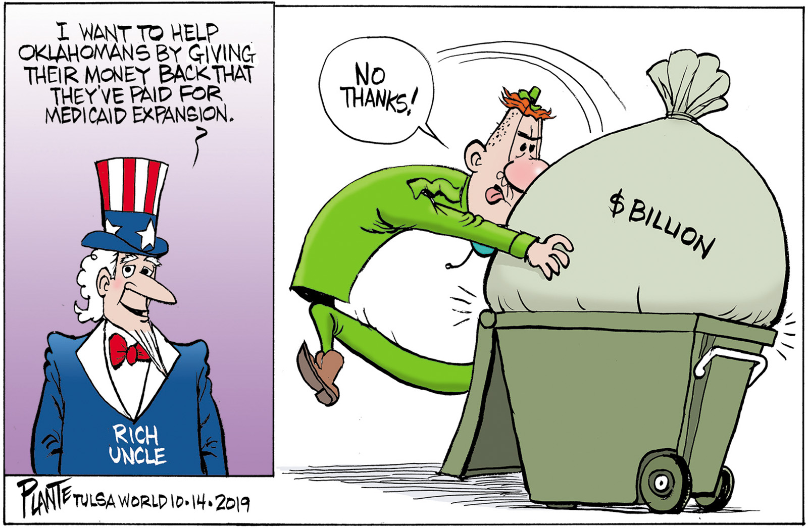 Tags/Keywords 138% of the federal poverty level, Initiative Petition, Medicaid expansion, OK, Oklahoma's rich uncle, Yes on 802, FILE: Plante20191015 Reprint This CartoonBuy A PrintBuy The Original REPRINT THIS CARTOON Fill out the info below and I'll be in touch ASAP Your Name (required) Your Email (required) Details, Print, Digital, Circulation, etc. Please leave this field empty. BUY A PRINT OF THIS CARTOON Fill out the info below and I'll be in touch ASAP Your Name(required) Your Email(required) Details, Number of copies, Questions. Please leave this field empty. BUY THE ORIGINAL Originals may or may not be available. Fill out the info below and I'll be in touch ASAP Your Name (required) Your Email (required) Your Message Please leave this field empty.