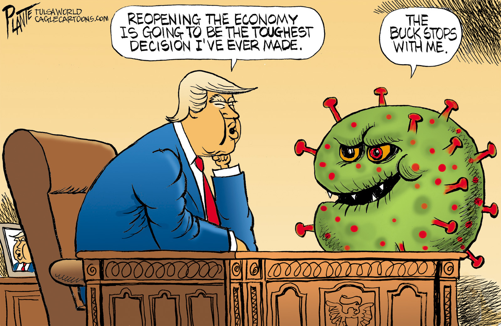 Tags/Keywords corona virus, covid-19, decision, President Donald J. Trump, The buck stops here, Trump and Reopening the Economy, FILE: Plante20200414 Reprint This CartoonBuy A PrintBuy The Original REPRINT THIS CARTOON Fill out the info below and I'll be in touch ASAP Your Name (required) Your Email (required) Details, Print, Digital, Circulation, etc. Please leave this field empty. BUY A PRINT OF THIS CARTOON Fill out the info below and I'll be in touch ASAP Your Name(required) Your Email(required) Details, Number of copies, Questions. Please leave this field empty. BUY THE ORIGINAL Originals may or may not be available. Fill out the info below and I'll be in touch ASAP Your Name (required) Your Email (required) Your Message Please leave this field empty.