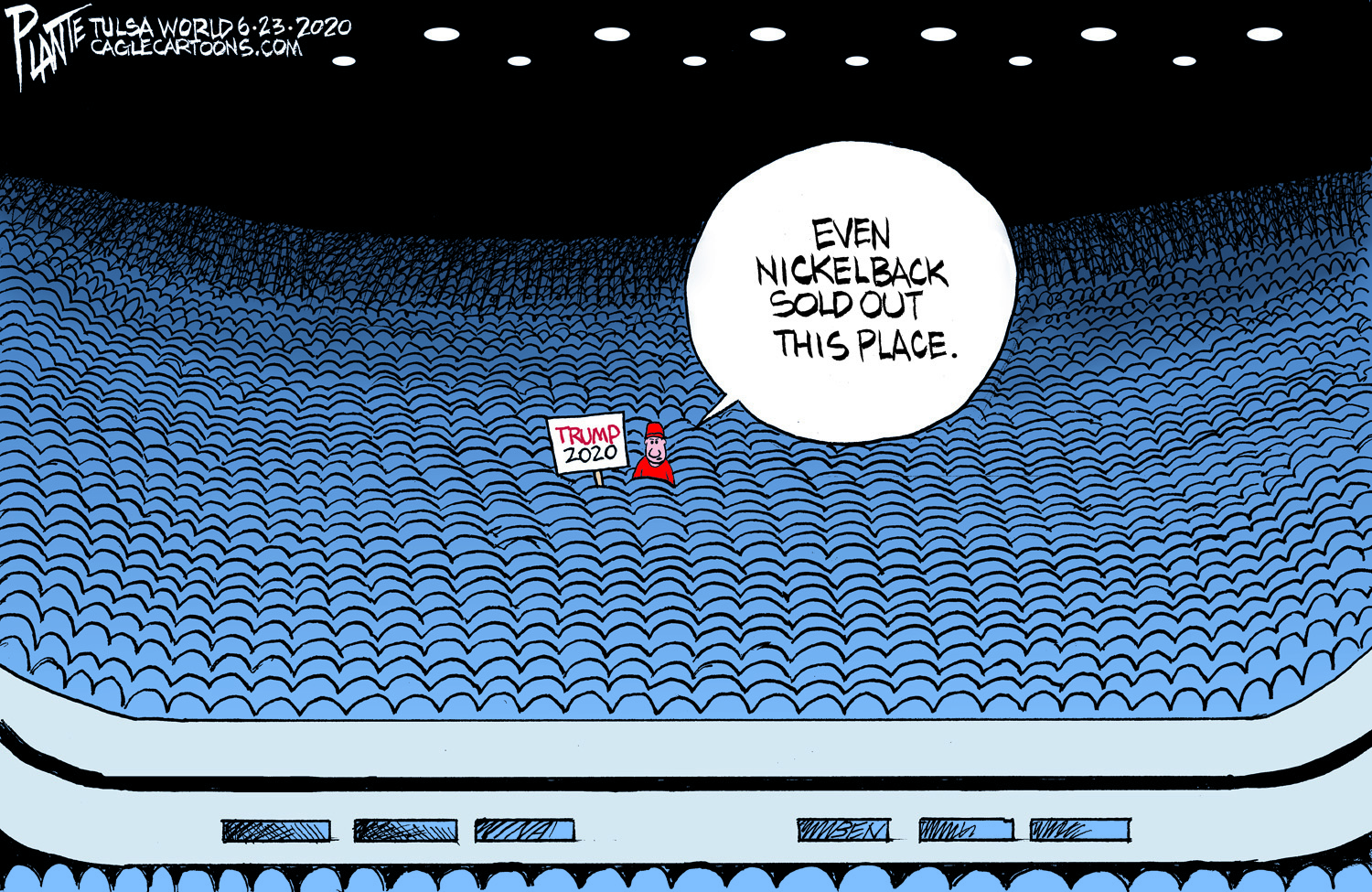 Tags/Keywords Arena, Black Lives Matter, BOK Center, Campaign 2020, Oklahoma, President Donald J. Trump, Presidential Race, Trump and Nickelback, Tulsa Rally, FILE: Plante20200625 Reprint This CartoonBuy A PrintBuy The Original REPRINT THIS CARTOON Fill out the info below and I'll be in touch ASAP Your Name (required) Your Email (required) Details, Print, Digital, Circulation, etc. Please leave this field empty. BUY A PRINT OF THIS CARTOON Fill out the info below and I'll be in touch ASAP Your Name(required) Your Email(required) Details, Number of copies, Questions. Please leave this field empty. BUY THE ORIGINAL Originals may or may not be available. Fill out the info below and I'll be in touch ASAP Your Name (required) Your Email (required) Your Message Please leave this field empty.